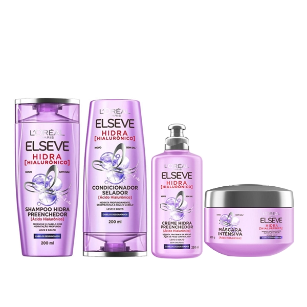 Shampoo Elseve Hidra Hialurônico Preenchedor 200ml A Linha Elseve Hidra Hialurônico preenche e retém hidratação profunda na fibra capilar para uma transformação instantânea dos fios. O Shampoo Preenchedor Elseve Hidra Hialurônico, especialmente desenvolvido com agentes condicionantes inteligentes, é capaz de promover ao mesmo tempo uma limpeza profunda e hidratação da raiz às pontas com resultados no primeiro uso. O Shampoo Preenchedor Elseve Hidra Hialurônico, limpa os fios profundamente ao mesmo tempo que proomove uma hidratação poderosa com resultados no primeiro uso. Com ação Preenchedora, retém a hidratação na fibra capilar por muito mais tempo, para manter o cabelo saudável, Leve e Solto. Modo de uso: Aplique nos cabelos molhados e massageie suavemente; Enxágue. Repita a operação se necessário. Atenção! Precaução: Manter fora do alcance das crianças. Caso o produto cais nos olhos, lave-os imediatamente com água. Condicionador Elseve Hidra Hialurônico Celador 200ml A Linha Elseve Hidra Hialurônico preenche e retém hidratação profunda na fibra capilar para uma transformação instantânea dos fios. O Condicionador Selador Elseve Hidra Hialurônico promove uma hidratação profunda. Sua fórmula promove o controle do frizz, desembaraça os fios e sela as cutículas, deixando os cabelos macios, saudáveis e soltos. Modo usar: Aplique em todo o comprimento, até as pontas. Deixe o produto agir e enxágue abundantemente. Atenção! Precaução: Manter fora do alcance das crianças. Caso o produto cais nos olhos, lave-os imediatamente com água. Mascara intensiva Elseve Hidra Hialurônico 300g A Linha Elseve Hidra Hialurônico peenche e retém hidratação profunda na fibra capilar para uma transformação instantânea dos fios. Precisando de um tratamento ainda mais intensivo para acabar com a desidratação? Nosso Creme de Tratamento Elseve Hidra Hialurônico deixa seu cabelo hidratado por muito mais tempo. Com Ação Preenchedora, controla os frizz, desembaraça os fios, deixando os cabelos saudáveis leves e soltos no primeiro uso. Modo de uso: Aplique nos fios lavados e úmidos; deixe agir por 5 minutos; Enxágue bem. Atenção! Precaução: Manter fora do alcance das crianças. Caso o produto cais nos olhos, lave-os imediatamente com água. Creme de Pentear Elseve Hidra Hialurônico Preenchedor 250ml O Creme Preenchedor Elseve Hidra Hialurônico é o aliado diário ideal para hidratar intensamente e desembaraçar os fios. Além de selar e prevenir contra pontas duplas, ele elimina o frizz e deixa seu cabelo com brilho intenso sem pesar. Sua fórmula previne contra pontas duplas e sela as cutículas, deixando os cabelos desembaraçados, leves, soltos e saudáveis. Modo de uso: Aplique sobre o cabelo úmido ou seco; não enxágue e penteie como de costume. Atenção! Precaução: Manter fora do alcance das crianças. Caso o produto cais nos olhos, lave-os imediatamente com água.Elseve Hidra Hialurônico Preenchedor Shampoo+Condicionador 200ml+Creme de Pentear 250ml+Mascara 300g