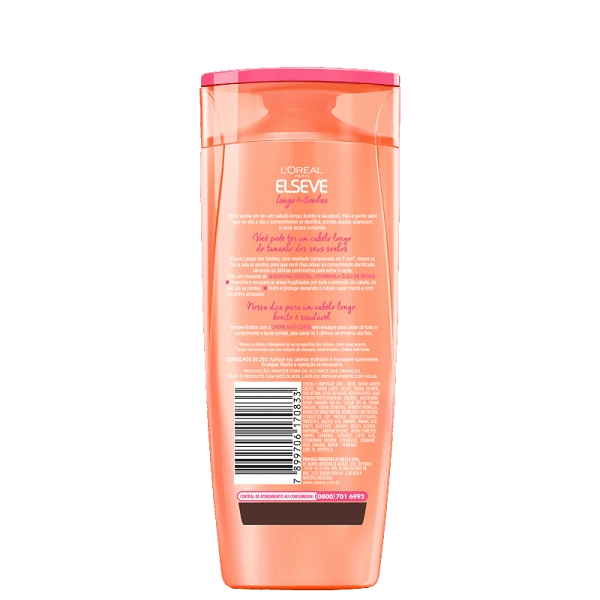 O Shampoo Elseve L'Oréal Paris Longo dos Sonhos é para você que sonha em ter um cabelo longo, bonito e saudável, mas que sabe que no dia a dia o comprimento se danifica. O Shampoo Elseve L'Oréal Paris apresenta fórmula cremosa e exclusiva com Queratina Vegetal, Vitaminas e Óleo de Rícino, que deixa o seu cabelo mais forte, macio e com um brilho único. Além de ajudar a salvar os seus últimos 3 centímetros, evitando o corte e promovendo um crescimento saudável, com o auxílio dos óleos presente na composição. Nutre e protege, deixando o cabelo super macio, reconstruindo os fios e lacrando as pontas. O produto também repara, sela, preenche e recupera o fio, preservando o comprimento, para você conquistar o cabelo do tamanho do comprimento dos seus sonhos.