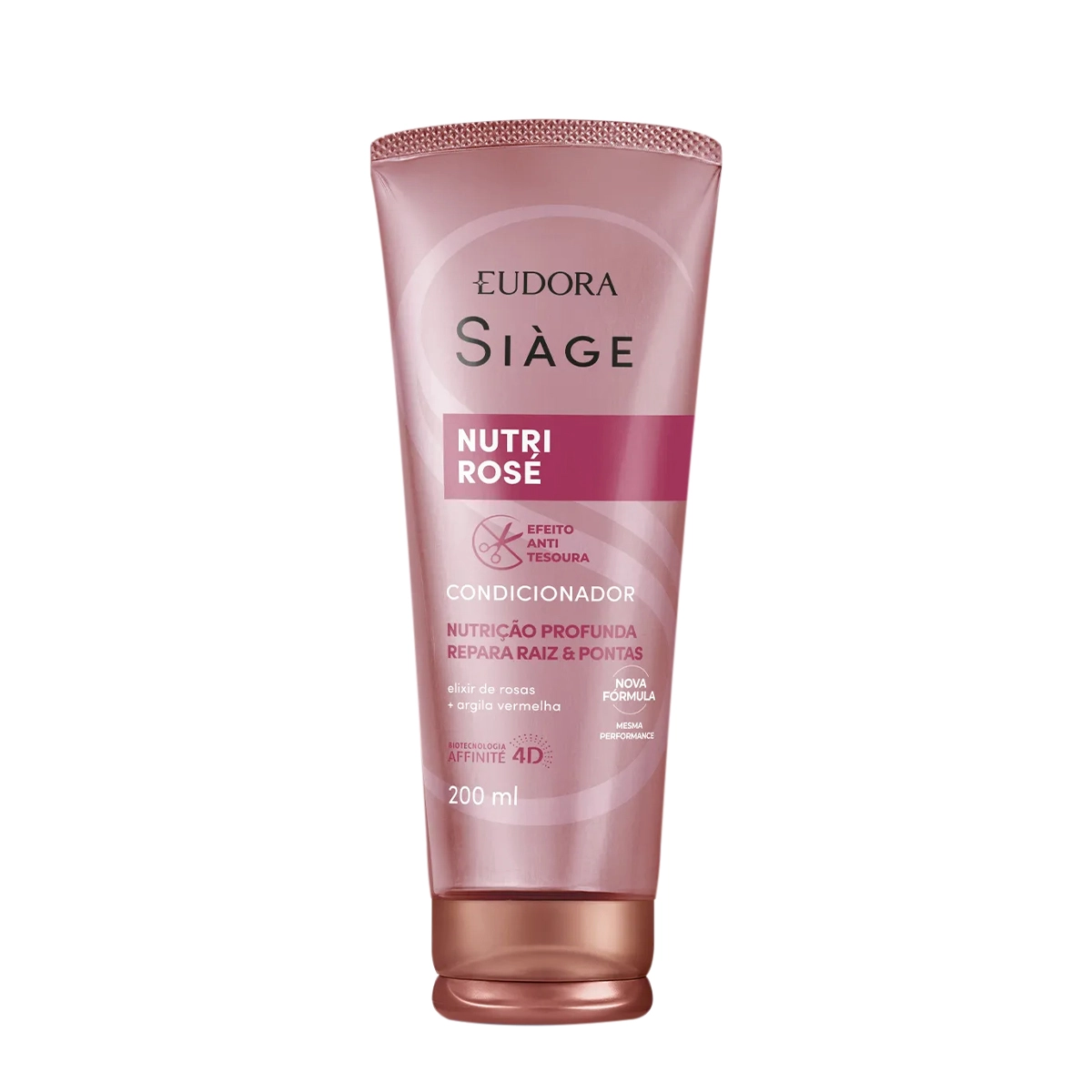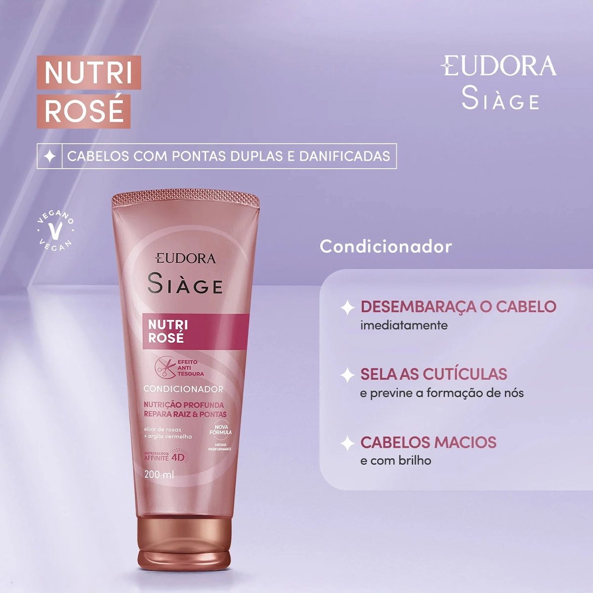 Para cabelos danificados. Entrega brilho natural, maciez e movimento. Altamente condicionante, desembaraça, sela as cutículas e previne a formação de nós. Formulado com elixir de rosas, proporciona nutrição profunda até a 3ª camada do fio sem pesar. Fortalece e diminui a quebra. Conselho de Aplicação Eudora Siàge Nutri Rosé - Condicionador 200ml