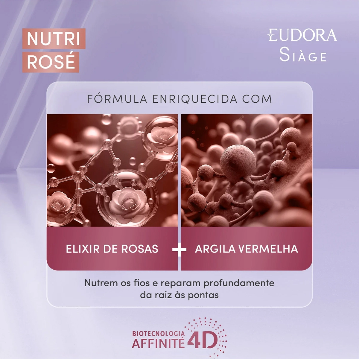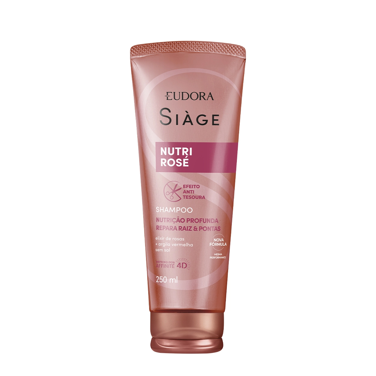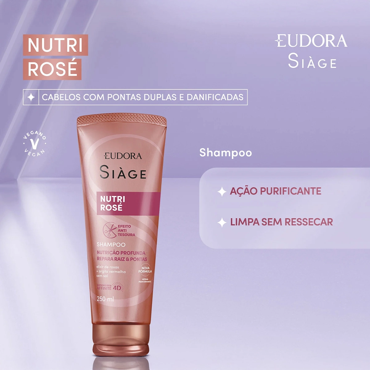 Para cabelos danificados. Limpa sem ressecar, com ação purificante, prepara os fios para receber o tratamento e contribui para um comprimento sem pontas duplas. Enriquecido com elixir de rosas, vitaminas e antioxidantes, nutre os fios com alto poder reparador. Eudora Siàge Nutri Rosé - Shampoo 250ml