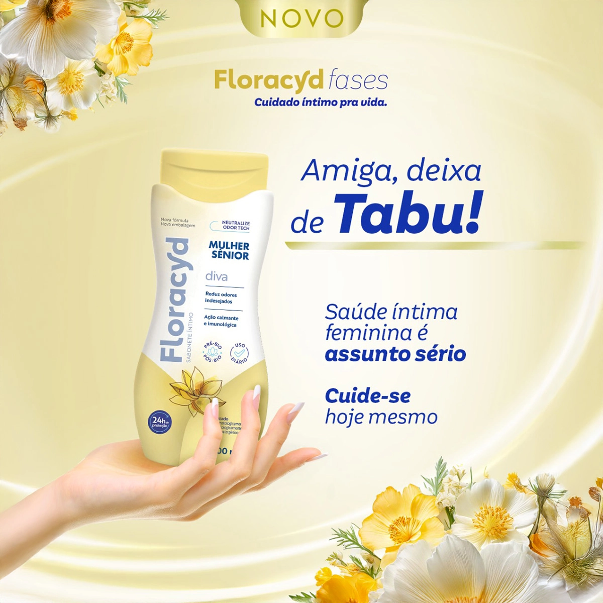 Oferece higiene delicada diária, com fórmula suave e tecnologias prebiótica e probiótica que equilibram a flora vaginal. Proporciona frescor e proteção por até 24 horas, é hipoalergênico, testado dermatológica e ginecologicamente, sem corantes para minimizar irritações.Floracyd Mulher Sênior Diva - Proteção e Cuidado Delicado para a Melhor Fase da Vida