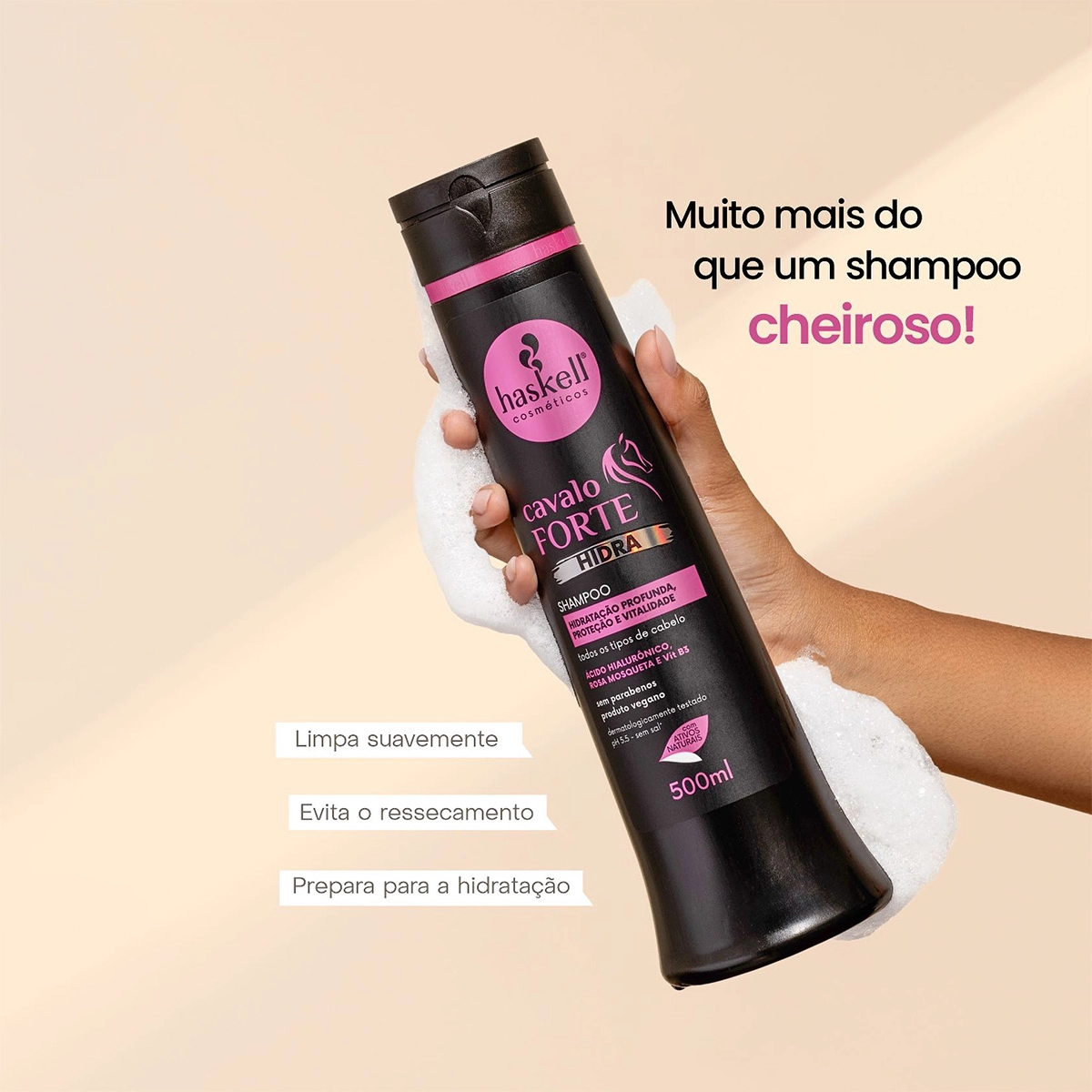 Haskell Hidra Cavalo Forte - Shampoo 500ml: promove limpeza suave e age diretamente na hidratação dos fios. Desenvolvido especialmente para realizar a reposição hídrica nos fios, formulado com ácido hialurônico, rosa mosqueta e vitamina B3 que agem na camada mais profunda do fio, evitando o ressecamento e deixando os cabelos com mais maleabilidade, hidratação intensa e brilho extra à fibra capilar.