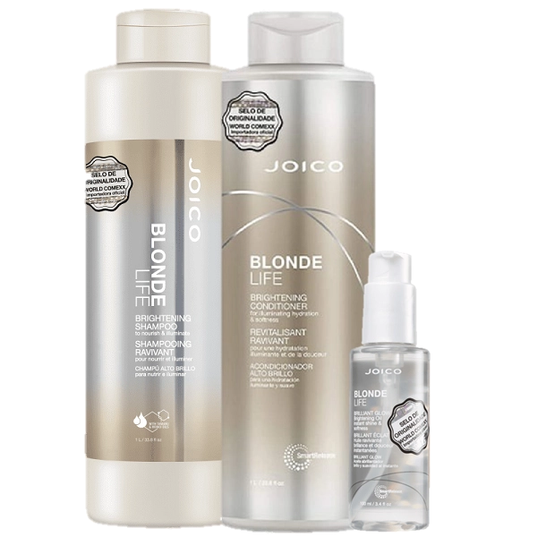Joico Blonde Life Brightening Duo 1L e Oleo Capilar 1 Joico Blonde Life Brightening Shampoo 1L 1 Joico Blonde Life Bringthening Glow Oleo Capilar 100ml Joico Blonde Life Brightening Kit Duo Profissional é indicado para o tratamento de cabelos loiros. Joico Blonde Life Brightening Shampoo higieniza os fios suavemente, protegendo o cabelo loiro enquanto repõe a maciez e o brilho. Restaura o pH ideal dos cabelos, produzindo uma espuma que preserva da oxidação, contra danos ambientais (raios UVA e UVB) e processos térmicos. Aplicação / Uso: Aplicar nos cabelos molhados, massageando suavemente até formar uma espuma. Enxaguar. Uso diário durante o banho. Recomenda-se uso associado ao Condicionador Iluminador Joico Blonde Life. Caso desejar, pode repetir a aplicação. Joico Blonde Life Brightening Condicionador revitaliza e desembaraça instantaneamente o cabelo. Sua fórmula com óleo de Tamanu e Monoi, ajuda a repor a força, a maciez e o brilho. Além disso, possui Arginina, que promove força aos fios, além de prevenir o amarelamento e danos causados pelo dia-a-dia. Modo de Uso: Aplicar em cabelo limpo e úmido. Deixar atuar durante 2 a 3 minutos. Enxaguar Joico Blonde Life Brilliant Glow Brightening Oil Óleo capilar indicado para cabelos loiros. Joico Blonde Life Brilliant Glow Brightening Oil proporciona brilho incrível de forma instantânea, além de combater o frizz e proteger os fios. Com óleos exóticos de monoi e tamanu, Joico Blonde Life Brilliant Glow Brightening Oil nutre e suaviza seus fios, além de promover redução de 87% da quebra ao pentear. Assim, revela um cabelo nutrido, radiante e com toque sedoso. Conselho de Aplicação Aplique 1-2 jatos no cabelo úmido ou seco. Finalize como preferir. Para proteção térmica, utilize antes do secador para deixar os cabelos mais macios e brilhantes. Nossos Experts Ensinam Aplique o óleo capilar primeiro nas mãos, para garantir uma distribuição mais uniforme. Esfregue e passe os dedos como um pente pelo comprimento e espalhe uniformemente pelo cabelo.