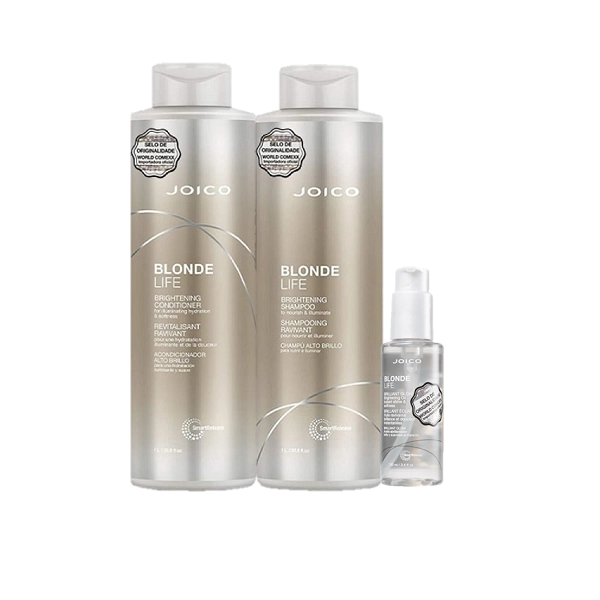 O Kit Joico Blonde Life mantém os seus fios sempre luminosos, nutridos e com aspecto saudável. Com fórmulas inteligentes e ingredientes poderosos, o combo - que apresenta 4 produtos indispensáveis na sua rotina de cuidados capilares - é ideal para impedir o desbotamento ou amarelamento da cor, além de proteger contra os mais diversos danos causados por fatores externos. Contém: Joico Blonde Life - Shampoo 1l: limpa de maneira suave e potente ao mesmo tempo, oferece proteção intensa, mantém a cor impecável por mais tempo e trata profundamente. Joico Blonde Life - Condicionador 1l: nutre até mesmo as pontas, hidrata intensamente, ajuda a desembaraçar, impede o desbotamento e resgata a maciez. Também fortalece e ilumina. Joico Blonde Life- Brilliant Glow Brightening Oil 100ml: nutre e suaviza seus fios, além de promover redução de 87% da quebra ao pentear. Assim, revela um cabelo nutrido, radiante e com toque sedoso. Conselho de Aplicação Com os cabelos previamente molhados, aplique o shampoo diretamente sobre a raiz dos fios e massageie suavemente o couro cabeludo até formar uma espuma cremosa. Em seguida, enxágue completamente. Caso ache necessário, repita a operação.Finalize com a aplicação do condicionador, que deve ser mantido nos fios - antes do último enxágue - por até 3 minutos. Em seguida Aplique 1-2 jatos do oil no cabelo úmido ou seco. Finalize como preferir. Para proteção térmica, utilize antes do secador para deixar os cabelos mais macios e brilhantes.