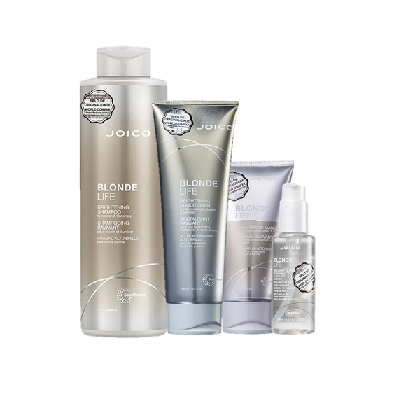 O Kit Joico Blonde Life mantém os seus fios sempre luminosos, nutridos e com aspecto saudável. Com fórmulas inteligentes e ingredientes poderosos, o combo - que apresenta 4 produtos indispensáveis na sua rotina de cuidados capilares - é ideal para impedir o desbotamento ou amarelamento da cor, além de proteger contra os mais diversos danos causados por fatores externos. Contém: Joico Blonde Life - Shampoo 1l: limpa de maneira suave e potente ao mesmo tempo, oferece proteção intensa, mantém a cor impecável por mais tempo e trata profundamente. Joico Blonde Life - Condicionador 250ml: nutre até mesmo as pontas, hidrata intensamente, ajuda a desembaraçar, impede o desbotamento e resgata a maciez. Também fortalece e ilumina. Joico Blonde Life Smart Release - Máscara Capilar 150ml: combate o ressecamento, melhora a maleabilidade, dá brilho, oferece ação detox, neutraliza o cloro, remove resíduos de outros minerais e evita o surgimento de tons amarelados. Joico Blonde Life Brilliant Glow Brightening- Oil 100ml: nutre e suaviza seus fios, além de promover redução de 87% da quebra ao pentear. Assim, revela um cabelo nutrido, radiante e com toque sedoso. Conselho de Aplicação Com os cabelos previamente molhados, aplique o shampoo diretamente sobre a raiz dos fios e massageie suavemente o couro cabeludo até formar uma espuma cremosa. Em seguida, enxágue completamente. Caso ache necessário, repita a operação.Depois, distribua a máscara uniformemente, deixe agir de 2 a 5 minutos e enxágue mais uma vez. Finalize com a aplicação do condicionador, que deve ser mantido nos fios - antes do último enxágue - por até 3 minutos. Em seguida aplique 1-2 jatos do oil no cabelo úmido ou seco. Finalize como preferir. Para proteção térmica, utilize antes do secador para deixar os cabelos mais macios e brilhantes.