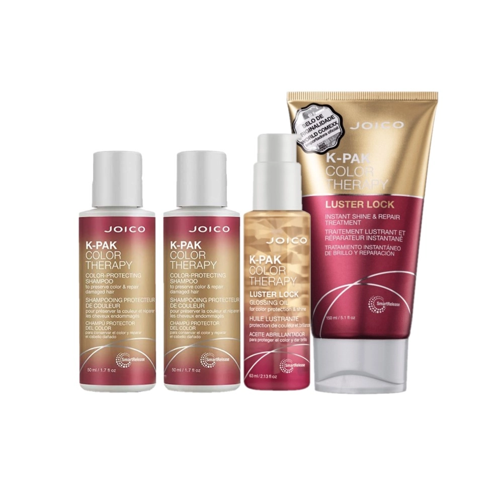 Este kit Contém Joico K PAK Color Therapy - Shampoo 50ml (2 unidades): preserva a cor limpa suavemente, enquanto melhora a elasticidade e o brilho do cabelo. Ajuda a restaurar e proteger o cabelo, proporcionando uma cor vibrante e duradoura. Joico K-PAK Color Therapy Luster Lock Smart Release 150ml: nutre, repara, hidrata e protege a cor dos cabelos. Traz fórmula com a perfeita combinação de ingredientes reconstrutores e antioxidantes, que proporciona cor vibrante e duradoura, cabelos mais fortes, intensificação do brilho, recuperação da saúde e hidratação dos fios. Joico K-PAK Color Therapy Luster Lock Smart Release – Óleo Capilar 60ml: para cabelos coloridos ou com mechas. Joico K-PAK Color Therapy Luster Lock Smart Release protege a cor, ilumina intensamente e garante maciez. Foi especialmente desenvolvido para tornar a sua rotina de cuidados capilares muito mais prática, segura e eficiente. Com formulação poderosa e ingredientes de alta performance, o produto é ideal para manter a sua coloração viva e radiante por muito mais tempo. Conselho de Aplicação Shampoo: aplique nos cabelos molhados. Espume. Enxague. Aplicar a seguir o condicionador ou tratamento k-pak color therapy. Máscara: aplique a máscara nos cabelos limpos e úmidos. Pause de 2 a 5 minutos e enxágue. Pode ser usada como pré-shampoo: aplique nos cabelos secos, pausando de 2 a 5 minutos. Enxágue e lave com shampoo e condicionador. Óleo: aplique de 1 a 2 doses de leave-in sobre os cabelos úmidos. Em seguida, penteie bem e finalize com o uso do secador. Joico K-PAK Color Therapy Color-Protecting Mask (4 Produtos)