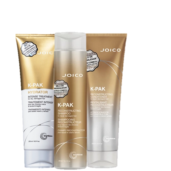 Joico K Pak Repair Damaged Trio Home Care contém: 1 Shampoo K Pak Repair Damaged 1 Condicionador K Pak Repair Damaged 1 Tratamento Intenso K Pak 1 Shampoo K Pak Repair Damaged Restaura a força dos fios danificados. Shampoo para cabelos danificados que restaura a elasticidade do cabelo danificado. Aplicação / Uso Aplicar nos cabelos molhados, massageando suavemente até formar uma espuma. Enxágue completamente. Se necessário, repita a aplicação. Uso diário durante o banho. 1 Condicionador K Pak Repair Damaged Hidrata e fortalece os fios. Condicionador para cabelos danificados ricamente hidratante. Fortalece os fios e desembaraça cabelos secos. Maciez, vivacidade, brilho e movimento natural. Aplicação / Uso Aplicar nos cabelos molhados, massageando suavemente até formar uma espuma. Enxaguar. Uso diário durante o banho. Máscara Joico K-PAK Intense Hydrator Smart Release Máscara Joico K-PAK Intense Hydrator Smart Release apresenta um tratamento intenso que que repõe a hidratação perdida nos fios, repara os danos e proporciona mais brilho. Além disso, sua fórmula sela as cutículas, reduz o frizz, garante fios macios e sedosos, e devolve a maleabilidade e elasticidade dos cabelos. Conselho de Aplicação Aplique nos cabelos limpos e úmidos. Pause por 5 minutos e enxágue completamente.