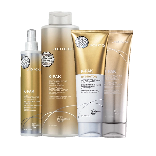Kit de tratamento para cabelos danificados. Kit Joico K-PAK To Repair Damage Hair Smart Release Duo ajuda a restaurar a elasticidade, fortalece e hidrata os fios. Kit Joico K-PAK To Repair Damage Hair Smart Release Duo traz poderosa tecnologia em reconstrução capilar para reparar e fortalecer os fios precisamente nos locais danificados. Garante resultado de maciez, vivacidade, brilho e movimento natural para o cabelo. Contém Joico K-PAK To Repair Damage Hair Smart Release - Shampoo 1L: higieniza de forma suave e eficaz, restaura a força e elasticidade dos fios danificados. Joico K-PAK To Repair Damage Hair Smart Release - Condicionador 250ml: ajuda a reconstruir e hidratar a fibra capilar, além de conferir maciez. om fórmula inovadora, capaz de proporcionar o dobro de resistência, o produto combate a quebra e ajuda a desembaraçar. Máscara Joico K-PAK Intense Hydrator Smart Release - Hydrator 250ml: apresenta um tratamento intenso que que repõe a hidratação perdida nos fios, repara os danos e proporciona mais brilho. Além disso, sua fórmula sela as cutículas, reduz o frizz, garante fios macios e sedosos, e devolve a maleabilidade e elasticidade dos cabelos. Tratamento Joico K-PAK Liquid Reconstructor Smart Release- Liquid 300ml: possui fórmula leave-in e não oleosa, que não adiciona peso nos fios. Confere os benefícios de reconstrução intensa e alta proteção térmica. Com a aplicação diária do produto, evita a quebra dos fios e promove uma ação que restabelece as proteínas necessárias, proporcionando força, leveza, brilho, suavidade e maciez. Modo de uso: Molhe os fios e, em seguida, aplique um pouco de shampoo diretamente no couro cabeludo. Depois, massageie de maneira gentil por alguns instantes. Assim que notar a formação de espuma em abundância, enxágue bem e repita todo o procedimento.Com os cabelos previamente higienizados e umedecidos, aplique uma pequena quantidade de condicionador sobre todo o comprimento e também pelas pontas dos fios. Aguarde por cerca de 1 minuto e enxágue bem, Aplique o Hydrator nos cabelos limpos e úmidos, pause por 5 minutos e enxágue completamente. Para a finalização aplique o Liquid nos fios úmidos ou levemente secos com toalha, penteie como desejar, não há necessidade de enxágue.