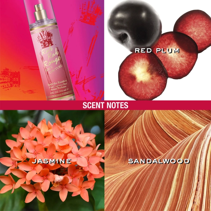 Juicy Couture Rock the Rainbow Rah Rah Rouge - Essência Divertida e Vibrante Cheia de energia e personalidade, essa fragrância floral frutada mistura frutas vibrantes e flores delicadas com o toque envolvente da baunilha e do sândalo. Doce, ousada e divertida, reflete o espírito livre de quem vive intensamente.