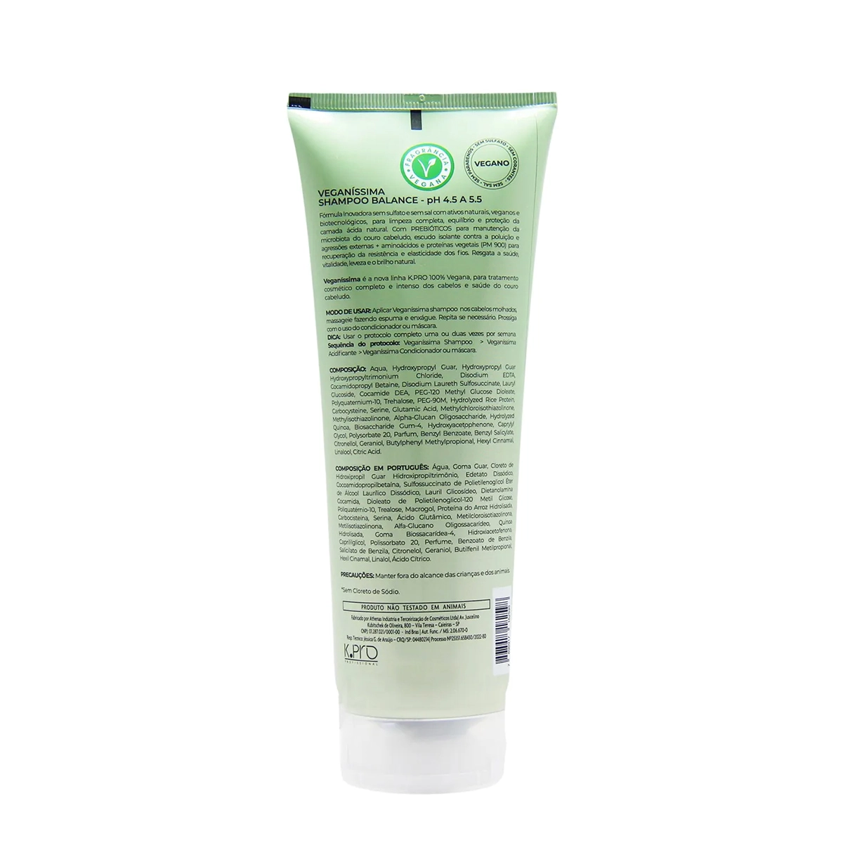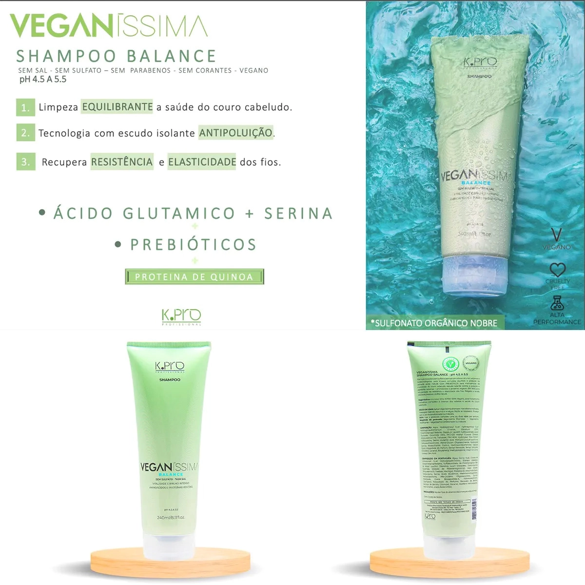 Fórmula Inovadora sem sulfato e sem sal com ativos naturais, veganos e biotecnológicos, para limpeza completa, equilíbrio e proteção da camada ácida natural. Com PREBIÓTICOS para manutenção da microbiota do couro cabeludo, escudo isolante contra a poluição e agressões externas + aminoácidos e proteínas vegetais (PM 900) para recuperação da resistência e elasticidade dos fios. Resgata a saúde, vitalidade, leveza e o brilho natural. Conselho de Aplicação K.Pro Balance Veganíssima Balance - Shampoo 240ml