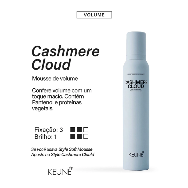Keune Style Cashmere Cloud - Volume e Proteção em Cada Fio Garante volume e corpo instantâneo sem rigidez. Com pantenol, proteínas vegetais e vitamina E, nutre, condiciona e protege os fios contra o calor de até 230ºC, deixando o cabelo cheio, macio e luminoso. Conselho de Aplicação