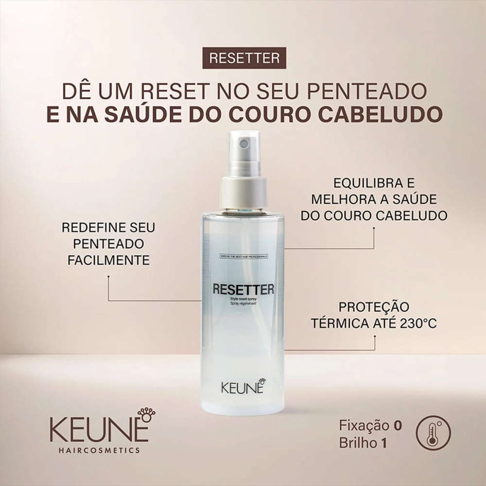 Keune Style Resetter é um spray redefinidor de penteados. Sua fórmula estimula a saúde do couro cabeludo e possui proteção térmica de 230°C. É um spray multibenefícios, que protege e melhora a saúde do couro cabeludo e reconstrói as pontes dissulfeto do cabelo. Keune Style Resetter - Spray Finalizador 200ml
