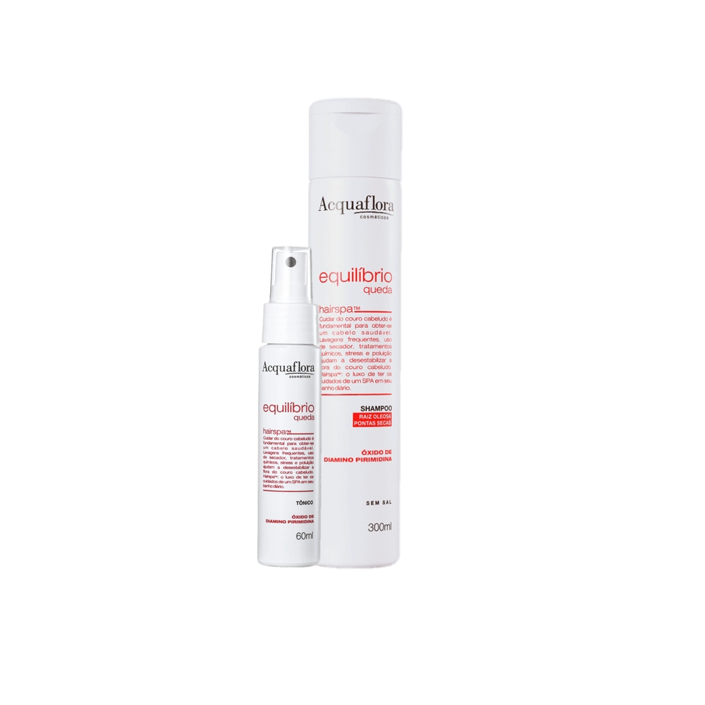 Acquaflora Equilíbrio Queda Raiz Oleosa Pontas Secas estimula o crescimento com prevenção à queda e equilibra a hidratação do comprimento dos fios. Acquaflora Equilíbrio Queda Raiz Oleosa Pontas Secas Limpa delicadamente os cabelos enquanto auxilia no controle da queda deixando o couro cabeludo saudável, sem ressecar os fios. Cuidado e saúde que traz equilíbrio a seus cabelos. Este Kit Contém Acquaflora Equilíbrio Queda Raiz Oleosa Pontas Secas - Shampoo 300ml: Limpa delicadamente os cabelos enquanto auxilia no controle da queda deixando o couro cabeludo saudável, sem ressecar os fios. Cuidado e saúde que traz equilíbrio a seus cabelos. Acquaflora Tonico Equilibrio Queda: Tônico capilar para o controle da queda. É um sistema de tratamento progressivo, auxilia na restauração do volume e a vitalidade dos cabelos. Previne a queda, e estimula o crescimento dos fios. Cuidado e saúde que traz equilíbrio a seus cabelos. Como Usar Conselho de Aplicação - Distribua uma pequena quantidade do shampoo por todo cabelo úmido e massageie suavemente até a formação de espuma. Em seguida, enxágue completamente. Kit Acquaflora Equilibrio Queda Raiz Oleosa Pontas Secas Queda Acentuada (2 Produtos)
