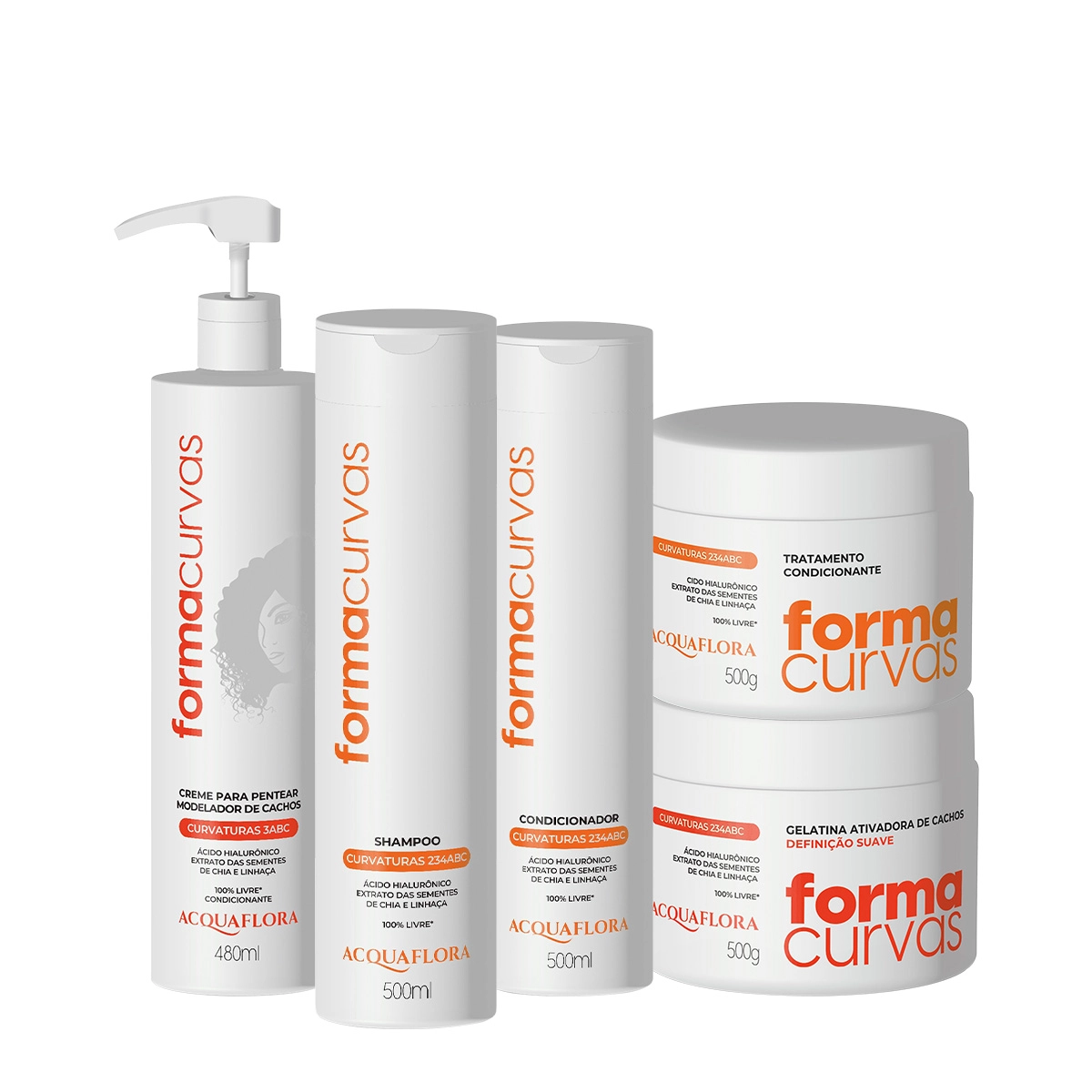 Kit Acquaflora Forma Curvas Shampoo Condicionador Tratamento Condicionante Creme de Pentear Cachos e Gelatina Suave (5 p