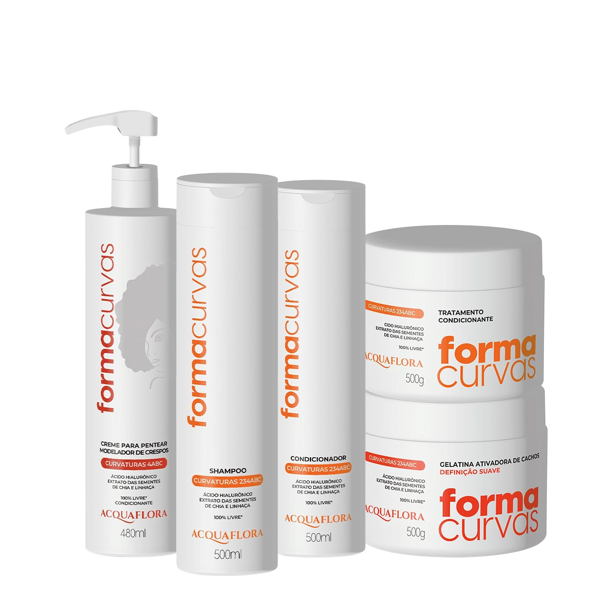 Kit Acquaflora Forma Curvas Shampoo Condicionador Tratamento Condicionante Creme de Pentear Crespos e Gelatina Suave (5