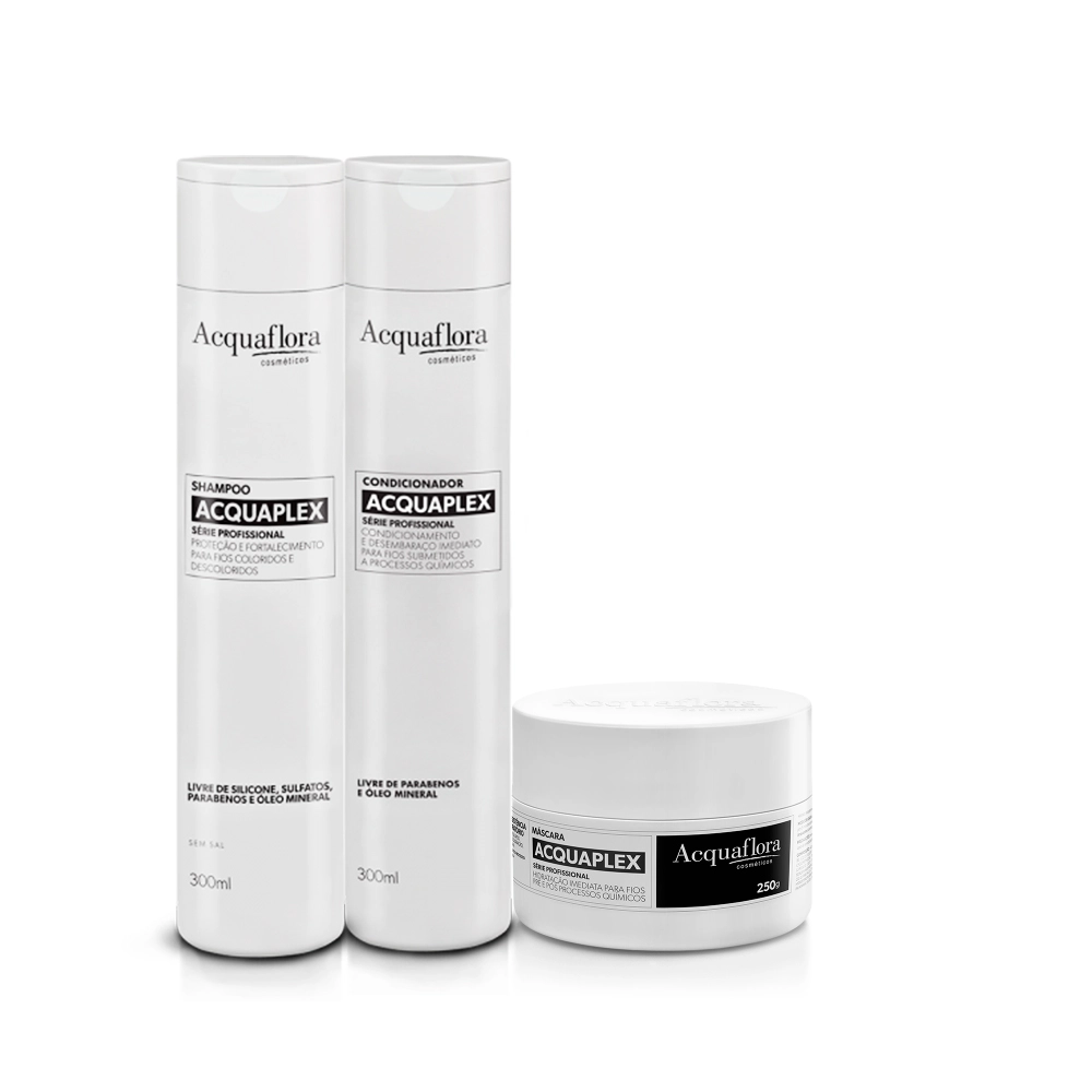 Esse Ki Contém Acquaplex - Máscara Capilar: Máscara para cabelos em pré ou pró processos químicos. Promove hidratação imediata a fibra capilar, para recuperar ou proteger os fios antes ou depois de receber química. Traz fórmula livre de parabenos e óleos minerais. Sua ação protege o fio contra o amarelamento dos fios após a descoloração e evita o que a cor desbote após as lavagens. Promove força e resistência a quebra, além de aumentar a maciez e brilho. Acquaflora Acquaplex Duo: Shampoo Indicado para lavar cabelos ultra processados por colorações, descolorações ou alisamentos. Lava suavemente os cabelos. Proporciona fácil desembaraçamento, melhorando a penteabilidade, o que contribui para a manutenção da integridade dos fios. Condicionador: Desembaraça imediatamente os fios submetidos a processos químicos. Conselho de Aplicação Máscara: Após o procedimento químico, enxaguar bem os fios e aplicar a máscara no comprimento e pontas. Deixar agir por 5 minutos e enxaguar. Utilize uma vez por semana para manutenção e hidratação dos cabelos quimicamente tratados. Duo: Após lavar os cabelos com o Shampoo, retirar o excesso de água e aplicar o Condicionador por todo o comprimento dos fios. Massagear por alguns minutos e enxaguar em seguidaKit Acquaflora Série Profissional Acquaplex - Máscara Capilar 250g & Acquaflora Acquaplex Duo 300ml (3 unidades)