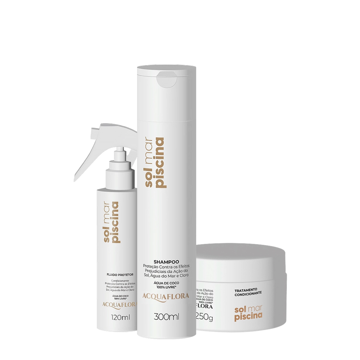 Este Kit Contém Acquaflora Sol Mar Piscina - Shampoo 300ml: limpa, protege e restaura os fios das agressões solares. Sua fórmula enriquecida com água de coco, sais minerais e silicones, promove ação condicionante e auxilia na remoção de resíduos acumulados nos fios. Acquaflora Sol Mar Piscina - Máscara Capilar 250g: hidrata, restaura e nutre profundamente as fibras capilares que sofreram agressões solares. Devolve a vitalidade para os fios, proporcionando maciez, brilho e proteção contra radiações solares. Acquaflora Sol Mar Piscina Fluído Protetor - Leave-in 120ml: para cabelos expostos ao sol, sal e cloro. Com filtro solar FPS15, textura fluída e fórmula enriquecida com água de coco, camomila e cúrcuma, cuida da fibra capilar, devolvendo brilho e maciez aos fios. Conselho de AplicaçãoKit Acquaflora Sol Mar Piscina Shampoo Máscara Leave-in (3 produtos)