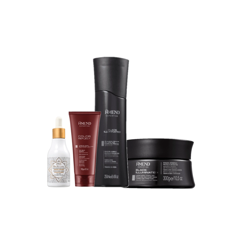 Este Kit Contém Amend Expertise Black Illuminated Realce da Cor - Shampoo para Cabelos Pretos 250ml: para cabelos pretos, ilumina e revitaliza o tom natural ou tingido, além de ajudar a hidratar os fios para proporcionar brilho intenso. A fórmula levemente pigmentada tonaliza com suavidade o cabelo. É rica em antioxidantes que impedem o desbotamento da cor para que ela dure por muito mais tempo. Amend Expertise Black Illuminated Realce da Cor - Máscara para Cabelos Pretos 300g: possui pigmentos que tonalizam e intensificam a cor dos fios com tons pretos naturais ou coloridos. Proporciona hidratação profunda, brilho e possui ação antioxidante, que evita o desbotamento e ajuda a reter a cor nos fios por mais tempo. Amend Expertise Color Reflect Blindagem da Cor - Creme Leave-in 180g: blinda a camada externa do fio, retendo os pigmentos de coloração dentro da estrutura do cabelo. Proporciona cor e brilho de longa duração. Ação antifrizz. Realça a cor e o brilho e protege dos raios solares. Contém os princípios ativos: proteína do arroz, aminocolor (fosfolipídios e vitamina F) e filtro solar. Sem enxague. Amend Millenar Óleos Marroquinos Elixir Nutritivo - Óleo Capilar 75ml: proporciona efeito suavizante, maciez, elasticidade e hidratação aos fios, através da rica combinação dos óleos marroquinos agindo na superfície dos fios, para deixá-los uniformes, bem alinhados e livres do frizz. Com óleos de Argan, Amêndoas e filtro solar. Conselho de Aplicação Shampoo: aplicar nos cabelos molhados, massageando os fios com as pontas dos dedos. Enxague e repita a operação. Máscara: após lavar os cabelos, retire o excesso de água com uma toalha e aplique a máscara do comprimento dos fios até as pontas. Deixe agir de 1 a 20 minutos e verifique constantemente o resultado da cor. Assim que atingir a nuance desejada, enxague bem. É necessária a utilização de luvas plástico durante a aplicação. Leave-in: após lavar os cabelos, aplique o creme para blindagem da cor nos cabelos molhados ou secos, do comprimento dos fios até as pontas. Não enxague. Finalize como de costume. Óleo: aplique uma pequena quantidade em todo o cabelo seco ou úmido desde o comprimento dos fios até as pontas, quantas vezes for necessário. Sem enxague. Kit Amend Expertise Black Reflect Cor Millenar (4 produtos)