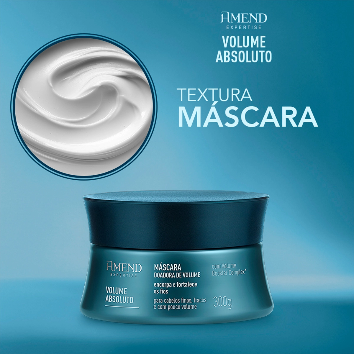 Amend Expertise Volume Absoluto - Máscara Capilar 300g: tratamento intensivo que hidrata, repara e promove volume desde a raiz. Fortalece a fibra capilar, protege contra o calor e garante fios encorpados, com movimento e maciez.