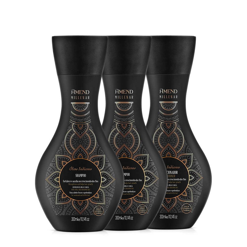 Esse Kit Contém Amend Millenar Óleos Indianos - Shampoo 300ml (2 produtos): Para cabelos fracos e quebradiços traz força e vitalidade aos fios enquanto limpa suavemente. O Shampoo Millenar Óleos Indianos, garante um crescimento fortificado, no qual o cabelo fica mais resistente à quebra. Sua fórmula tonifica o couro cabeludo para garantir fios saudáveis desde a raiz. Amend Millenar Óleos Indianos - Condicionador 300ml: Para cabelos fracos e quebradiços. Aumenta a resistência e resgata a saúde dos fios, além de facilitar o pentear. O Condicionador Millenar Óleos Marroquinos, da Amend, ajuda na reparação da estrutura interna da fibra capilar para que ela fique mais forte e saudável. Sua fórmula ainda devolve a vitalidade perdida com as agressões externas para melhorar a aparência do cabelo. Conselho de AplicaçãoKit Amend Millenar Óleos Indianos Shampoo Extra e Condicionador (3 produtos)