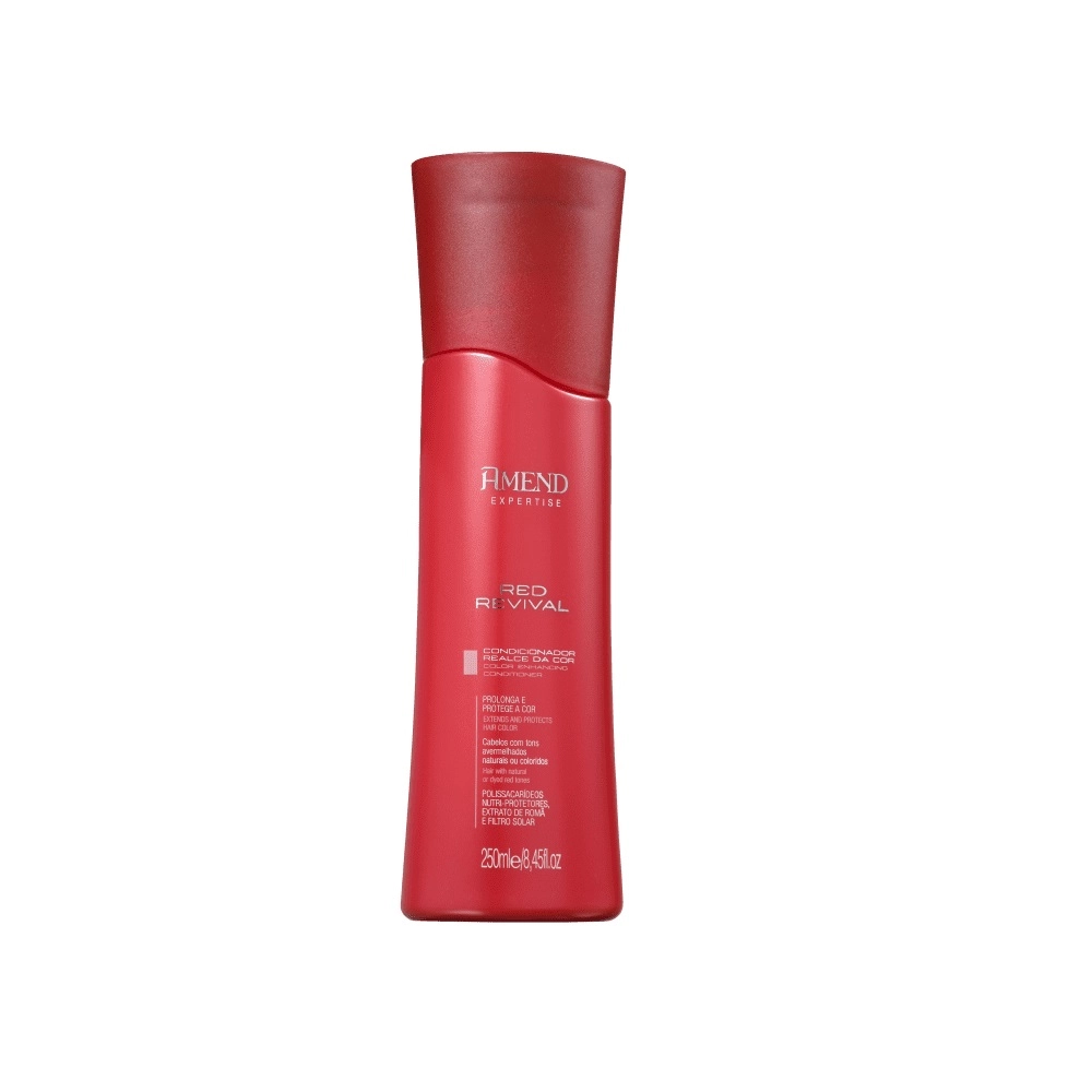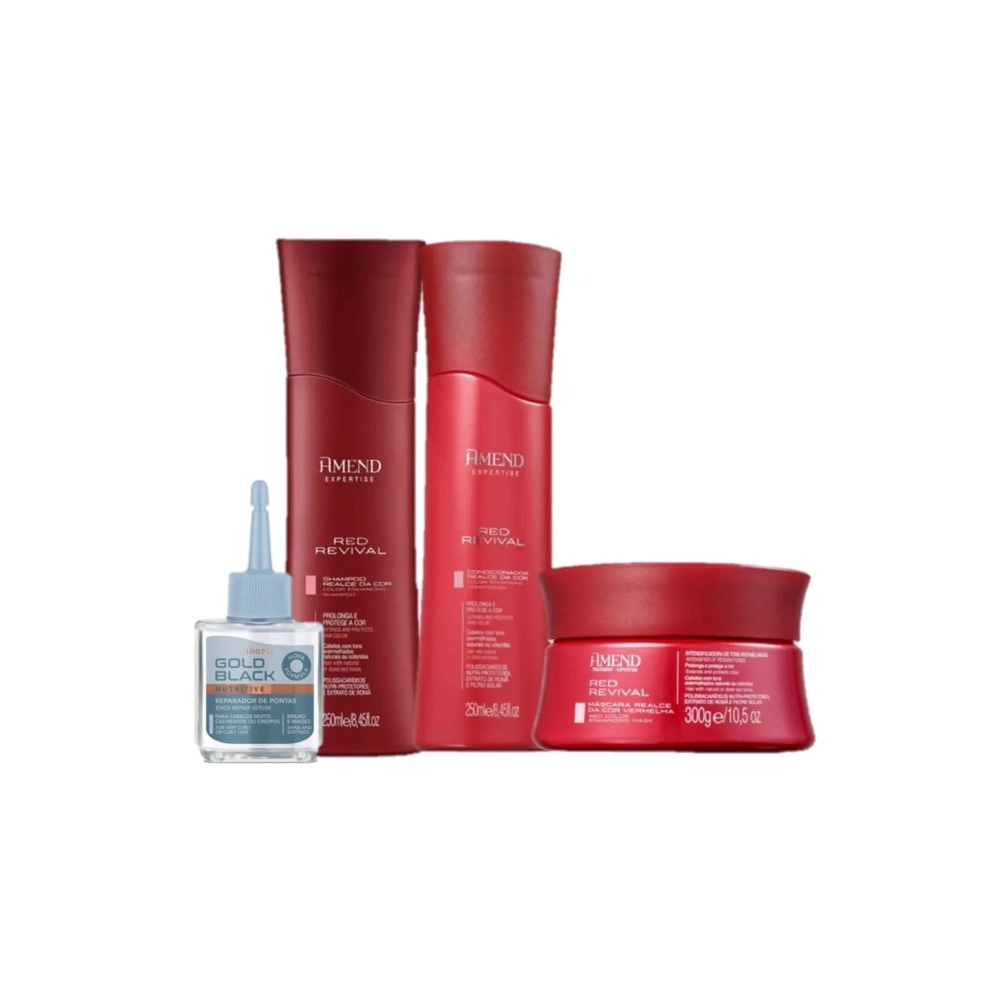 Kit de tratamento para cabelos com tons avermelhados, intensifica e prolonga a beleza da cor. Também hidrata e forma um escudo protetor que proporciona cabelos saudáveis, luminosos e macios. promove limpeza e nutrição intensa, além de prevenir o desbotamento. Com ele, seus fios ficam sedosos, macios e com um vermelho vibrante. Este Kit Contém Amend Red Revival Realce da Cor - Shampoo 250ml: limpa suavemente e prolonga a cor. Amend Red Revival Realce da Cor - Condicionador 250ml: reestrutura a extensão dos fios, melhora a quebra e o frizz. Amend Red Revival - Máscara 300g: nutre intensamente a fibra e intensifica a cor. Amend Gold Black Nutritivo - Ultra Reparador de Pontas 30ml: condiciona e recupera as extremidades do fio. Perfeito para quem tem os cachos definidos, mas as pontinhas ressecadas e rebeldes. Conselho de Aplicação Shampoo: passe o shampoo sobre o cabelo molhado e massageie o couro cabeludo. Ao surgir espuma, enxágue e repita o processo. Máscara: remova o excesso de água com uma toalha. Aplique a máscara de tratamento da metade dos fios para baixo e massageie bem cada mecha. Deixe agir por 5 minutos e remova completamente com água. Condicionador: prossiga com o condicionador, por todo o comprimento e pontas. Espalhe bem e massageie as mechas, depois enxague. Reparador de Pontas: espalhe 2 ou 3 gotas entre as mãos, depois aplique no comprimento e pontas do cabelo úmido ou seco. Enrole os cachos nos dedos ou amasse suavemente para modelar. Não precisa de enxague.Kit Amend Realce da Cor Red Revival Reparador (4 produtos)