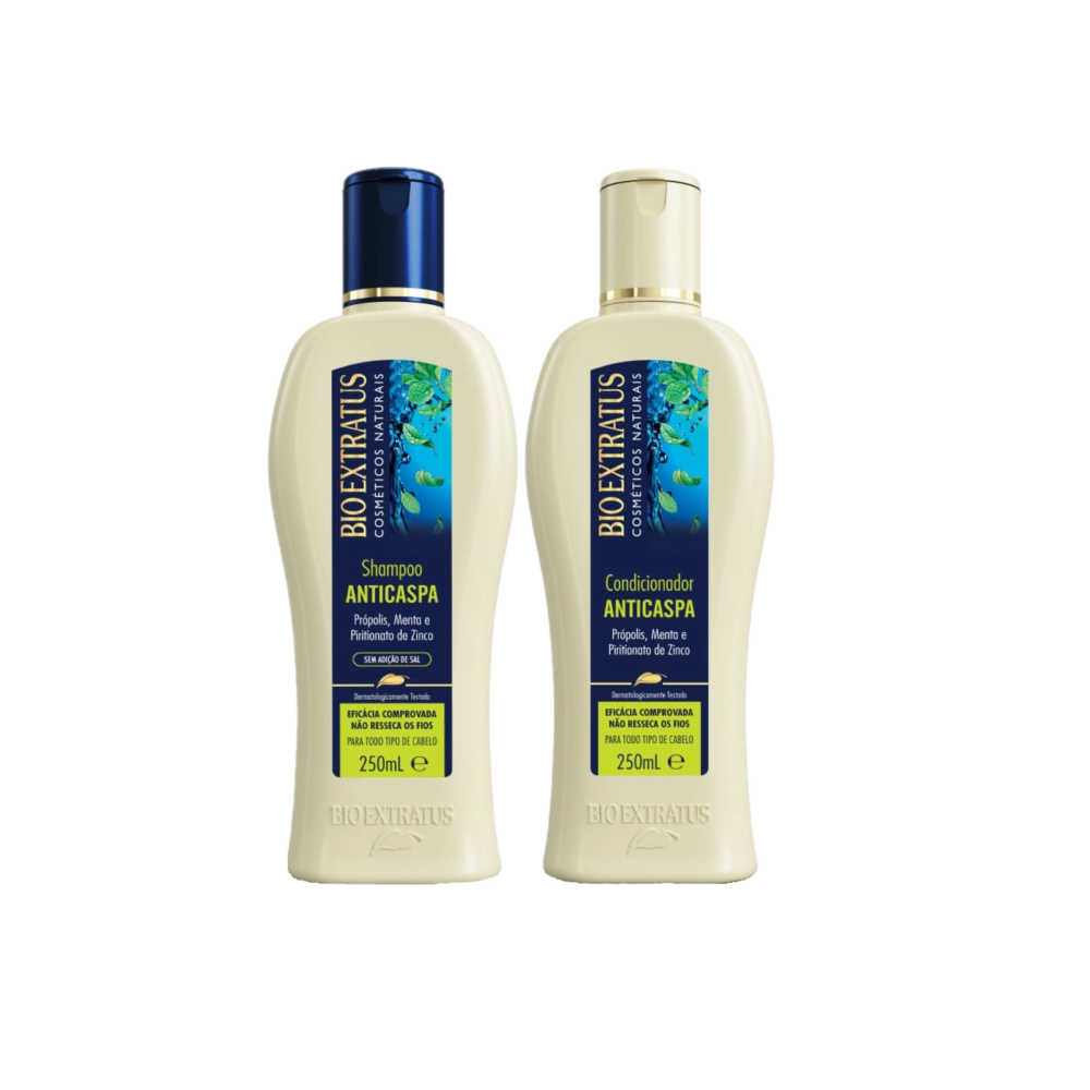 Este Kit Contém Bio Extratus - Shampoo Anticaspa 250ml: reduz o excesso de oleosidade sem ressecar. Limpa e trata, com 100% de hidratação. Desenvolvido para cabelos com caspa, e que precisam de um cuidado maior durante a lavagem. Sua fórmula reúne os mais potentes ativos naturais e tecnológicos em uma linha comprovada de ação anticaspa, que mantém a saúde e hidratação dos cabelos. Formulado com própolis, menta e piritionato de zinco, sem adição de sal e dermatologicamente comprovado. Bio Extratus - Condicionador Anticaspa 250ml: oferece hidratação imediata, sem pesar nos fios. Desenvolvido para promover um tratamento que auxilia no combate à caspa sem ressecar ou agredir os fios. Conselho de Aplicação Shampoo: aplique sobre os cabelos molhados, massageando suavemente, sem esfregar. Enxague bem. Se necessário, repita a aplicação. Condicionador: após lavar os cabelos com shampoo, aplique o condicionador por toda a extensão dos fios, massageando suavemente. Deixe agir de 1 a 2 minutos. Enxague abundantemente. Kit Bio Extratus Duo Anticaspa (2 produtos)