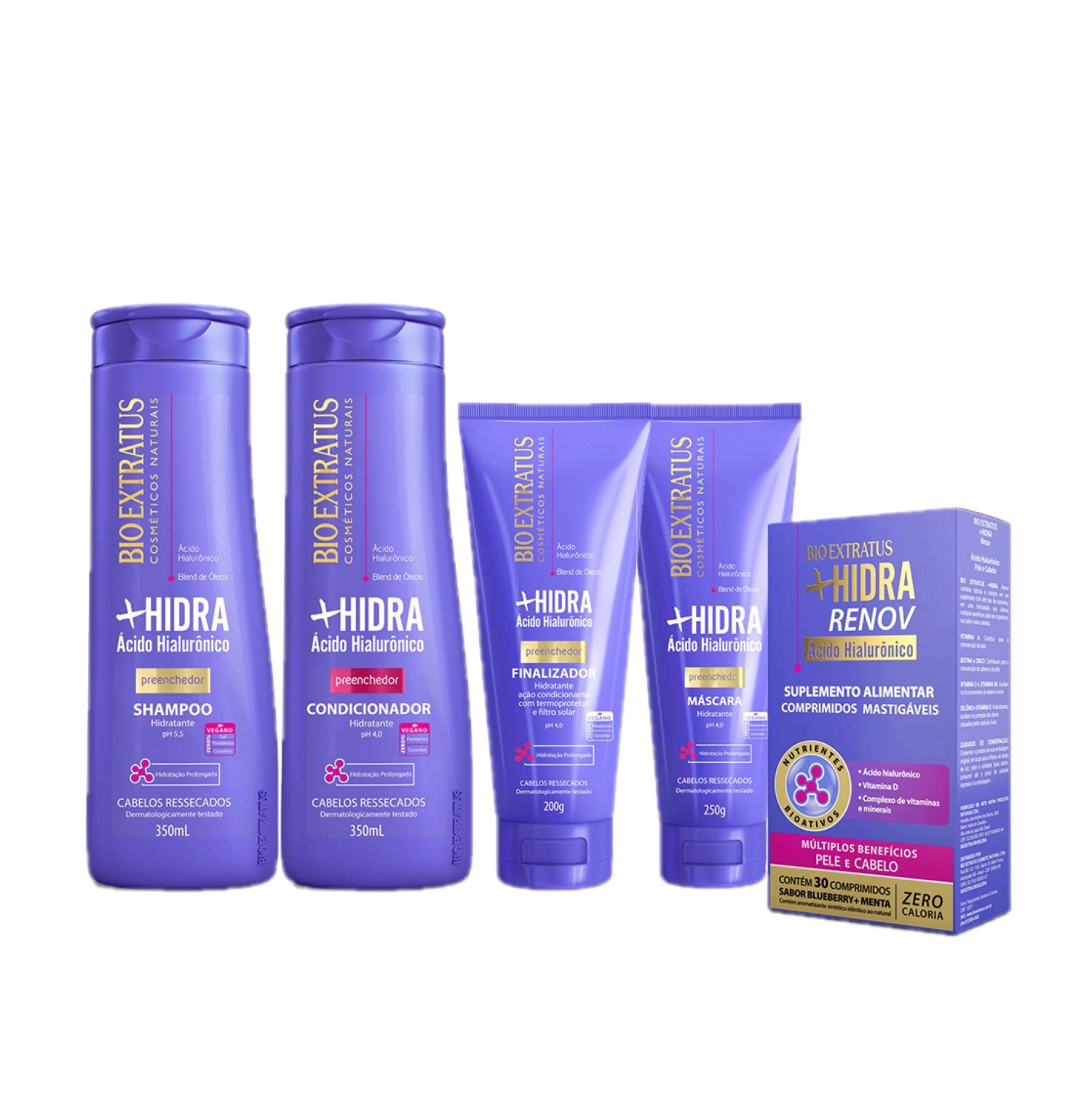 Este kit contém: Bio Extratus +Hidra – Shampoo 350ml: limpa tratando os fios, porque hidrata profundamente enquanto retira a sujidade. Fórmula sem sal, parabenos e corantes. pH 5,5. Bio Extratus +Hidra – Condicionador 350ml: deposita os ativos no fio e fecha as cutículas, dando brilho e condicionamento intensos. pH 4,0. Bio Extratus +Hidra - Máscara 250g: repõe água e massa em profundidade, restaurando completamente o fio, que fica macio, flexível e com muito brilho. pH 4,0. Bio Extratus +Hidra - Finalizador 200g: alinha, trata e protege, deixando os fios brilhantes e totalmente recuperados. Possui termoprotetor e filtro solar. pH 4,0. Bio Extratus Suplemento +Hidra – 30 comprimidos: combina ciência e nutrição em um suplemento com alto teor de nutrientes, em uma formulação benéfica para seu organismo, sua pele e seus cabelos. Ação • Ácido Hialurônico – antioxidante, promove hidratação, elasticidade e sustentação da pele. Ajuda na manutenção dos cabelos. • Vitamina A – contribui para a manutenção da pele. Shampoo: aplique nos cabelos molhados, massageando suavemente. Enxágue. Se necessário, repita a aplicação. Use também os outros produtos da linha +Hidra. Condicionador: após lavar os cabelos com shampoo, aplique o condicionador por toda a extensão dos fios, massageando suavemente. Deixe agir por alguns minutos. Enxágue. Use também os outros produtos da linha +Hidra. Máscara: após lavar os cabelos, aplique a máscara, massageando mecha a mecha. Para intensificar o tratamento, use touca de hidratação. Deixe agir de 3 a 5 minutos. Enxágue. Use também os outros produtos da linha +Hidra. Finalizador: aplique sobre os cabelos úmidos e distribua ao longo dos fios, principalmente nas pontas e regiões mais danificadas. Não enxágue. Penteie normalmente. Pode ser usado antes de escovar para proteger os fios. Use também os outros produtos da linha +Hidra. Suplemento: 1 comprimido por dia, preferencialmente à noite, próximo ao horário de dormir. Caixa com 30 comprimidos mastigáveis.Kit Bio Extratus + Hidra Completo (5 produtos)