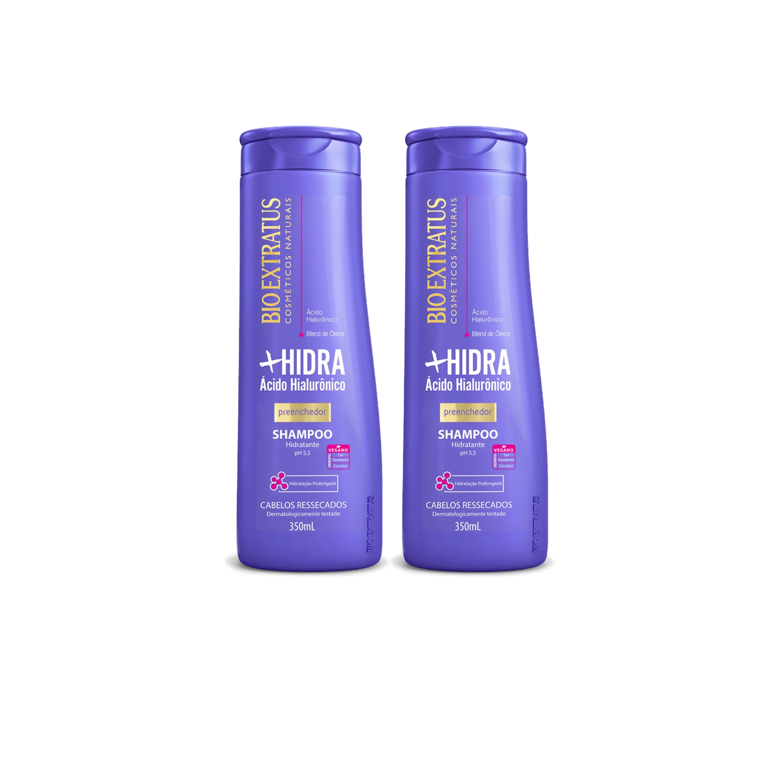 A Bio Extratus inovou e trouxe uma linha cujo principal ativo é o ácido hialurônico. A ideia é promover uma potente hidratação para os fios ressecados, sejam eles lisos, ondulados, cacheados ou crespos. O mais bacana é que a linha é testada e tem eficácia comprovada na melhora do brilho e do diâmetro do fio. Este kit contém: Bio Extratus +Hidra – Shampoo 350ml (2 unidades): limpa tratando os fios, porque hidrata profundamente enquanto retira a sujidade. Fórmula sem sal, parabenos e corantes. pH 5,5. Conselho de Aplicação Shampoo: aplique nos cabelos molhados, massageando suavemente. Enxágue. Se necessário, repita a aplicação. Use também os outros produtos da linha +Hidra.Kit Bio Extratus +Hidra Limpeza Master (2 unidades)