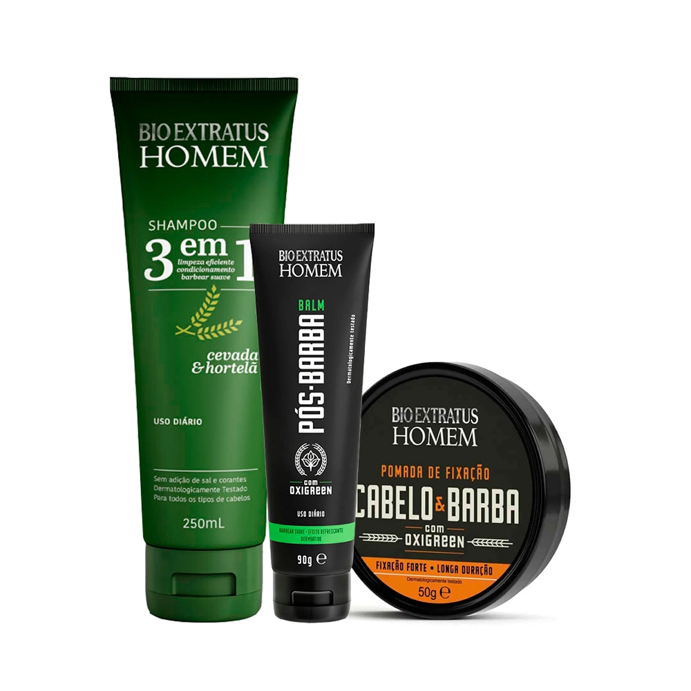 Kit Bio Extratus Homem Cabelo e Barba Gel (3 produtos) Esse Kit Contém Bio Extratus Homem 3 em 1 - Shampoo 250ml: fórmula multifuncional que associa o poder nutritivo da cevada à refrescância da hortelã. Limpa e condiciona os cabelos. Facilita o deslizamento da lâmina durante o barbear, deixando a pele macia e perfumada. Bio Extratus Homem - Pós-Barba 90g: suavidade e conforto para a pele do rosto e do pescoço após o barbear. Não é oleoso e deixa uma agradável sensação de frescor. Bio Extratus Homem Cabelo e Barba - Gel Fixador Forte 150g: Gel Fixador Forte auxilia em penteados com longa duração. Sem corantes, proporciona uma finalização com mais brilho e não deixa resíduos. Conselho de Aplicação Shampoo: aplique nos cabelos molhados massageando suavemente. Enxague. Se necessário, repita a aplicação. Para barbear, espalhe o produto no rosto umedecido e barbeie como de costume. Enxágue.