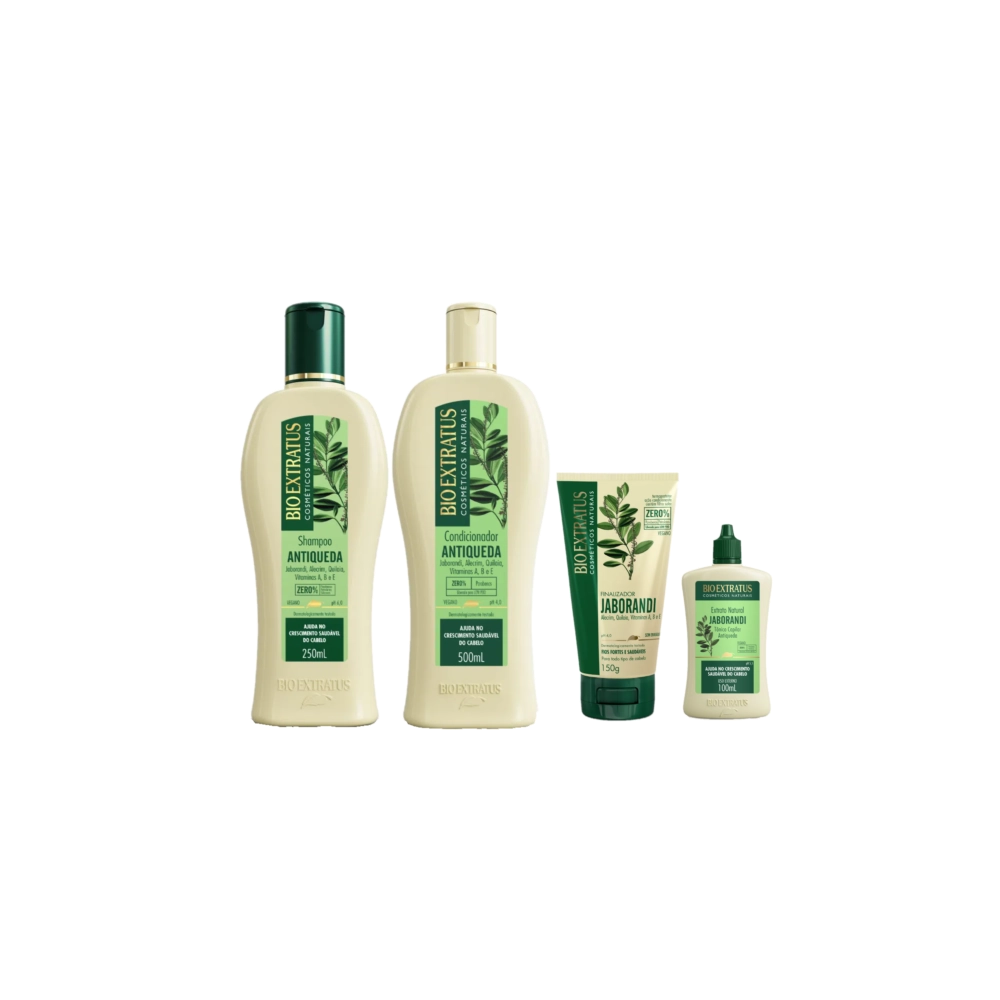 Este Kit Contém Bio Extratus Jaborandi Antiqueda - Shampoo 500ml: limpa e revitaliza o cabelo. A associação balanceada dos extratos e vitaminas nutre o bulbo capilar e tonifica o couro cabeludo, proporcionando força e saúde ao cabelo. Bio Extratus Jaborandi Antiqueda - Condicionador 500ml: condiciona e revitaliza o cabelo, fortalecendo os fios. Bio Extratus Extrato Jaborandi Antiqueda - Tônico 100ml: ativa a circulação do couro cabeludo e nutre os fios, evitando a queda. Ajuda no crescimento saudável do cabelo. Bio Extratus Jaborandi Antiqueda - Finalizador 150g: combinação exclusiva de extratos vegetais, enriquecida com vitaminas que revitalizam, fortalecem e restauram cabelos com queda e pouco crescimento. Rico em vitaminas e extratos naturais que nutrem os fios, deixando o cabelo forte e saudável. Conselho de Aplicação Shampoo: distribua uniformemente sobre o cabelo molhado, massageando suavemente sem esfregar os fios. Enxágue bem e, se necessário, repita a aplicação. Condicionador: pode ser de uso diário ou para hidratação semanal, aplique após o banho de creme, massageando suavemente. Para maior absorção dos ativos, deixe agir por alguns minutos. Enxague. Tônico: aplique nas raízes massageando suavemente. Deixe agir por 15 minutos. Lave normalmente o cabelo. Pode ser adicionado ao banho de creme em hidratações capilares. Finalizador: aplique no cabelo úmido e distribua ao longo dos fios, principalmente nas pontas e regiões mais danificadas. Não enxague. Penteie normalmente. Use também os outros produtos da Linha Antiqueda Jaborandi, Alecrim e Quilaia, Vitaminas A, B e E.Kit Bio Extratus Jaborandi Antiqueda Finalizador (4 produtos)