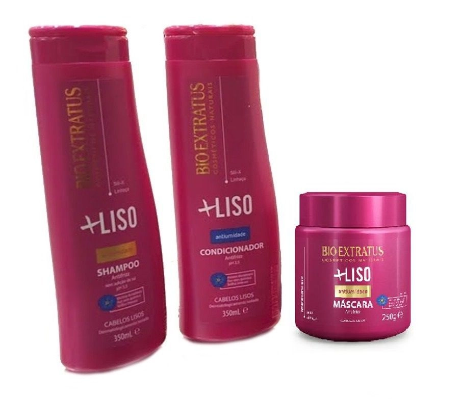 Contém: 1 Shampoo 350ml + 1 Condicionador 350ml + 1 Máscara 250g da linha Mais Liso da Bio Extratus Sem adição de sal, promove uma limpeza eficaz sem ressecar os cabelos. Perfeito para uso diário. Alinha os fios, deixando-os mais lisos, leves e com muito brilho.