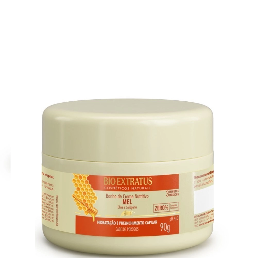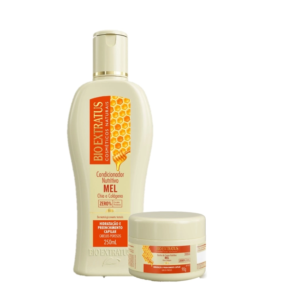 Mel, chia e colágeno, juntos, repõem umidade, massa e nutrientes em profundidade. Zero% corantes e parabenos. pH 4,0. Este Kit Contém Bio Extratus Mel - Condicionador Nutritivo 250ml: dá condicionamento imediato aos fios, hidrata e nutre, reparando a porosidade. Bio Extratus Mel - Banho de Creme Nutritivo 90g: oferece intensa hidratação e nutrição para cabelos porosos, preenchendo as falhas da fibra capilar. Como Usar Conselho de Aplicação Condicionador: após lavar os cabelos, aplique o condicionador, massageando suavemente. Deixe por alguns minutos e enxágue. Banho de Creme: após lavar os cabelos, aplique o creme, massageando da raiz até as pontas. Para intensificar o tratamento, use o vaporizador, touca de hidratação ou toalha umedecida em água quente. Deixe agir por 3 minutos, enxágue. Kit Bio Extratus Mel Condicionamento e Preenchimento Capilar (2 Produtos)