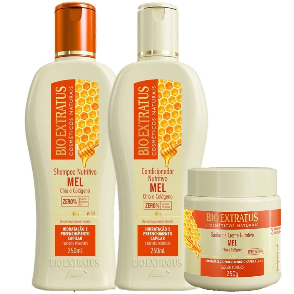 Mel, Chia e Colágeno, juntos, repõem massa, umidade e nutrientes em profundidade. Este Kit Contém Bio Extratus Mel - Shampoo Nutritivo 250ml: promove limpeza hidratante e nutritiva, e inicia o tratamento de preenchimento dos fios porosos. Bio Extratus Mel - Condicionador Nutritivo 250ml: dá condicionamento imediato aos fios, hidrata e nutre, reparando a porosidade. Bio Extratus Mel - Banho de Creme Nutritivo 250g: oferece intensa hidratação e nutrição para cabelos porosos, preenchendo as falhas da fibra capilar. Como Usar Conselho de Aplicação Shampoo: aplique nos cabelos molhados, massageando suavemente. Enxágue. Se necessário, repita a aplicação. Condicionador: após lavar os cabelos, aplique o condicionador, massageando suavemente. Deixe por alguns minutos e enxágue. Banho de Creme: após lavar os cabelos, aplique o creme, massageando da raiz até as pontas. Para intensificar o tratamento, use o vaporizador, touca de hidratação ou toalha umedecida em água quente. Deixe agir por 3 minutos, enxágue.Kit Bio Extratus Mel Home Care Dupla Nutricao e Hidratacao (3 Produtos)