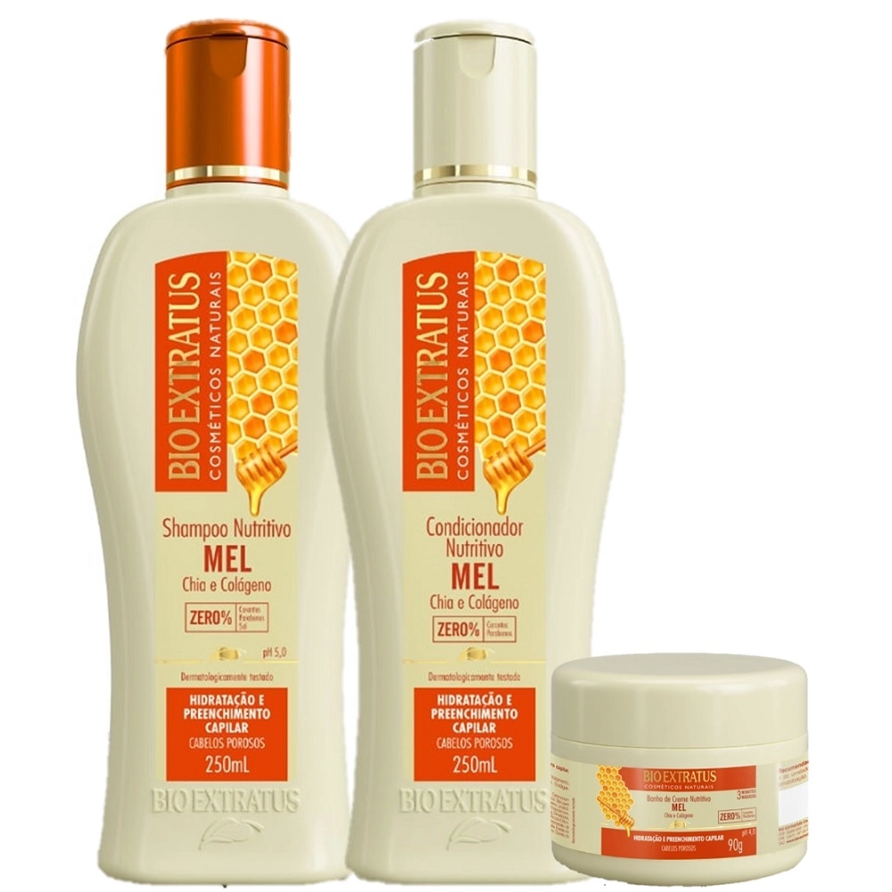 Mel, Chia e Colágeno, juntos, repõem massa, umidade e nutrientes em profundidade. Este Kit Contém Bio Extratus Mel - Shampoo Nutritivo 250ml: promove limpeza hidratante e nutritiva, e inicia o tratamento de preenchimento dos fios porosos. Bio Extratus Mel - Condicionador Nutritivo 250ml: dá condicionamento imediato aos fios, hidrata e nutre, reparando a porosidade. Bio Extratus Mel - Banho de Creme Nutritivo 90g: oferece intensa hidratação e nutrição para cabelos porosos, preenchendo as falhas da fibra capilar. Como Usar Conselho de Aplicação Shampoo: aplique nos cabelos molhados, massageando suavemente. Enxágue. Se necessário, repita a aplicação. Condicionador: após lavar os cabelos, aplique o condicionador, massageando suavemente. Deixe por alguns minutos e enxágue. Banho de Creme: após lavar os cabelos, aplique o creme, massageando da raiz até as pontas. Para intensificar o tratamento, use o vaporizador, touca de hidratação ou toalha umedecida em água quente. Deixe agir por 3 minutos, enxágue.Kit Bio Extratus Mel Home Care Dupla Nutricao e Preenchimento Capilar (3 Produtos)