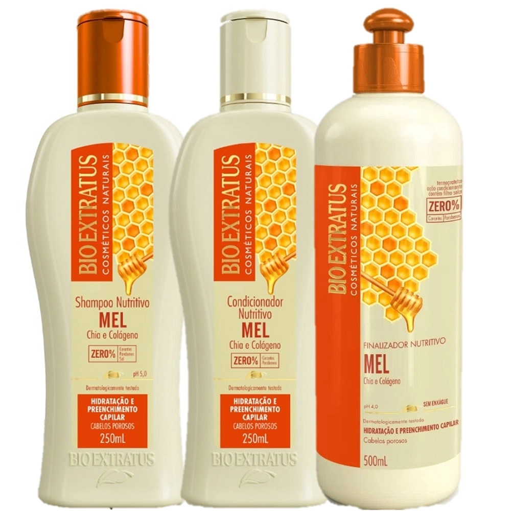 Mel, Chia e Colágeno, juntos, repõem massa, umidade e nutrientes em profundidade. Este Kit Contém Bio Extratus Mel - Shampoo Nutritivo 250ml: promove limpeza hidratante e nutritiva, e inicia o tratamento de preenchimento dos fios porosos. Bio Extratus Mel - Condicionador Nutritivo 250ml: dá condicionamento imediato aos fios, hidrata e nutre, reparando a porosidade. Bio Extratus Mel - Finalizador Nutritivo 500g: protege do sol, do calor do secador e oferece hidratação para os cabelos o dia todo. Como Usar Conselho de Aplicação Shampoo: aplique nos cabelos molhados, massageando suavemente. Enxágue. Se necessário, repita a aplicação. Condicionador: após lavar os cabelos, aplique o condicionador, massageando suavemente. Deixe por alguns minutos e enxágue. Finalizador: aplique nos cabelos úmidos e distribua ao longo dos fios, principalmente nas pontas e regiões mais danificadas. Não enxágue. Penteie normalmente.Kit Bio Extratus Mel Home Care Dupla Nutricao e Protecao (3 Produtos)