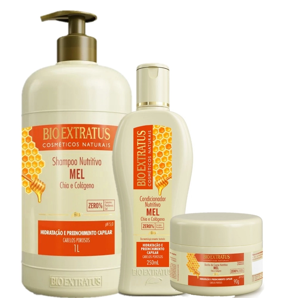 Mel, chia e colágeno, juntos, repõem umidade, massa e nutrientes em profundidade. Zero% corantes e parabenos. pH 4,0. Este Kit Contém Bio Extratus Mel - Shampoo Nutritivo 1L: promove limpeza hidratante e nutritiva, e inicia o tratamento de preenchimento dos fios porosos. Bio Extratus Mel - Condicionador Nutritivo 250ml: dá condicionamento imediato aos fios, hidrata e nutre, reparando a porosidade. Bio Extratus Mel - Banho de Creme Nutritivo 90g: oferece intensa hidratação e nutrição para cabelos porosos, preenchendo as falhas da fibra capilar. Como Usar Conselho de Aplicação Shampoo: aplique nos cabelos molhados, massageando suavemente. Enxágue. Se necessário, repita a aplicação. Condicionador: após lavar os cabelos, aplique o condicionador, massageando suavemente. Deixe por alguns minutos e enxágue. Banho de Creme: após lavar os cabelos, aplique o creme, massageando da raiz até as pontas. Para intensificar o tratamento, use o vaporizador, touca de hidratação ou toalha umedecida em água quente. Deixe agir por 3 minutos, enxágue. Kit Bio Extratus Mel Limpeza e Condicionamento (3 Produtos)