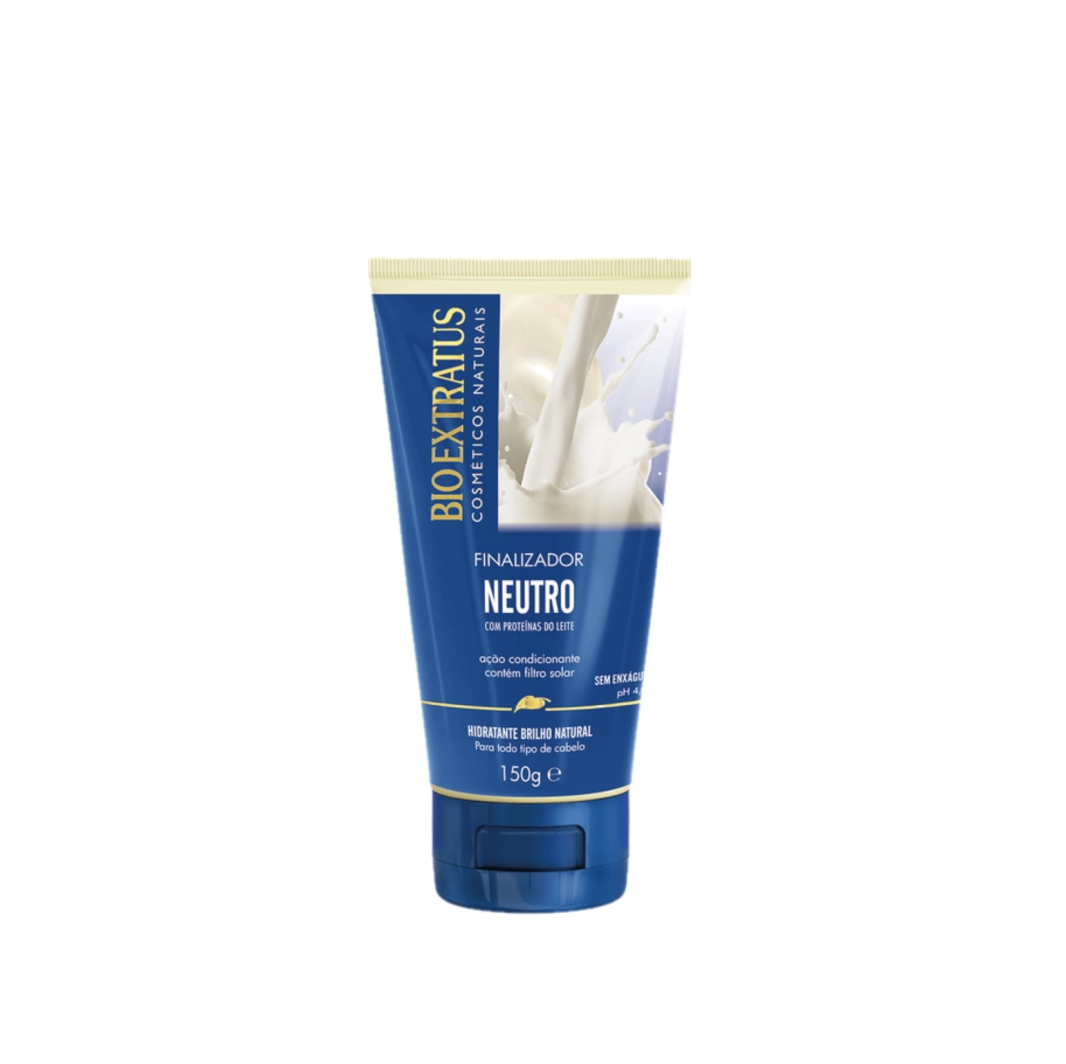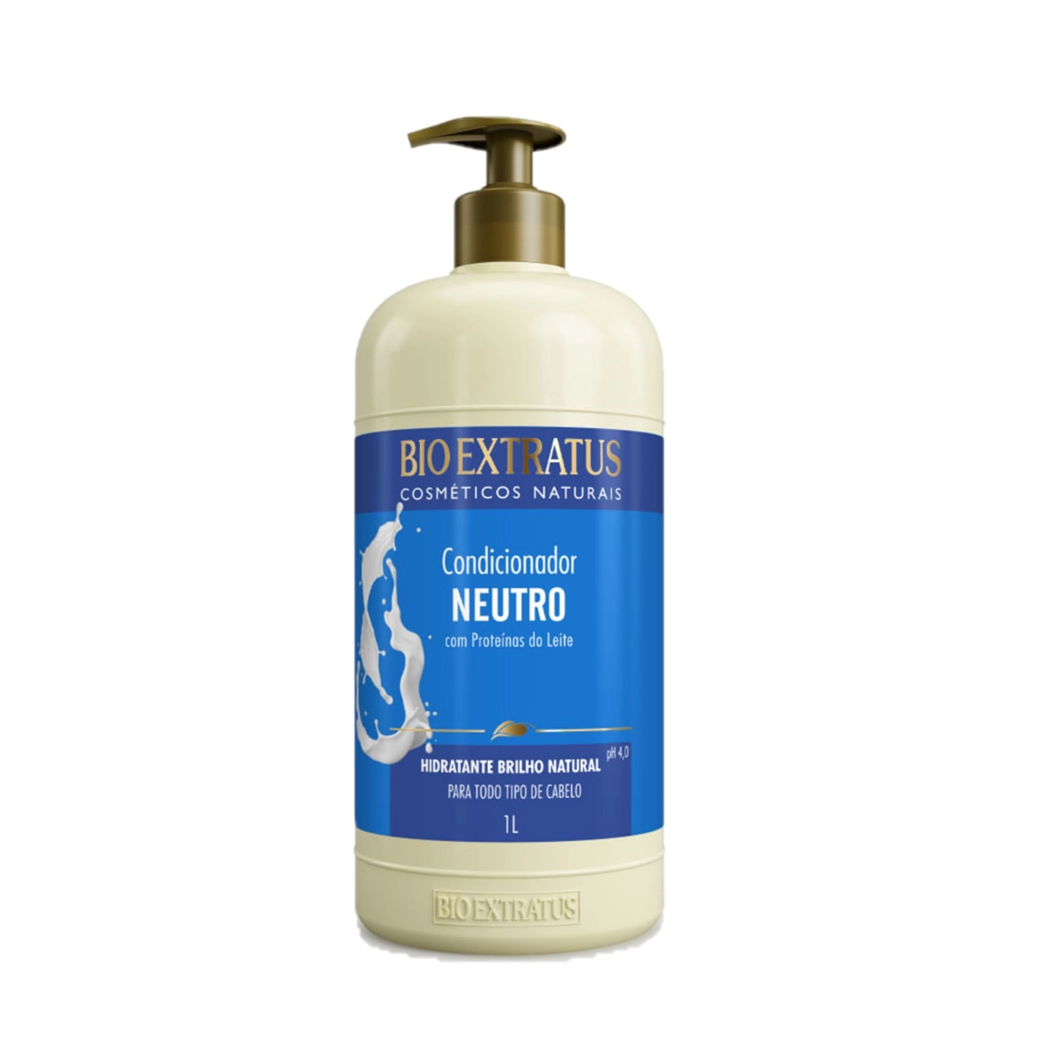 Bio Extratus Neutro Proteínas do Leite limpa e hidrata profundamente o cabelo secos deixando macios e com brilho. Sua fórmula contém proteínas naturais para hidratar e realçar o brilho dos cabelos. Sua fórmula é indicada para limpar delicadamente todos os tipos de cabelos, inclusive os cabelos tingidos. Bio Extratus Neutro - Shampoo 1L: com proteínas naturais para hidratar e realçar o brilho de todos os tipos de cabelo. Fórmula indicada para limpar delicadamente os fios. pH 5,5. Sem adição de sal. Bio Extratus Neutro - Condicionador 1L: para todos os tipos de cabelo. Bio Extratus Neutro promove ação hidratante que condiciona, desembaraça e realça o brilho. pH 4,0. Bio Extratus Neutro - Máscara 500g: com base neutra, ingredientes suaves, enriquecidas com proteínas naturais do leite. Limpa delicadamente os fios e promove um tratamento hidratante que confere proteção, maciez e realça o brilho natural do cabelo. Bio Extratus - Finalizador 150g: o Finalizador Bio Extratus Neutro pode ser usado diariamente no cabelo. Conta com ação condicionante e contém filtro solar. Deixa os cabelos hidratados, saudáveis, macios e brilhantes, além de protegidos. Shampoo: distribua uniformemente sobre o cabelo, massageando sem esfregar os fios. Enxágue bem e, se necessário, repita a aplicação. Condicionador: para uso diário, deve ser usado após o shampoo. Na hidratação semanal, aplique após o banho de creme, massageando suavemente. Para maior absorção dos ativos, deixe agir por alguns minutos. Enxágue. Máscara: aplique massageando mecha a mecha e deixe agir por 10 minutos. Para intensificar o tratamento, use touca de hidratação. Enxágue. Finalizador: aplique nos cabelos úmidos e distribua ao longo dos fios, principalmente nas regiões mais danificadas. Não enxágue. É fundamental sempre aplicar um produto protetor térmico antes do secador ou da chapinha. Isso ajuda a proteger os fios. Kit Bio Extratus Neutro Brilho Natural Completo (4 produtos)