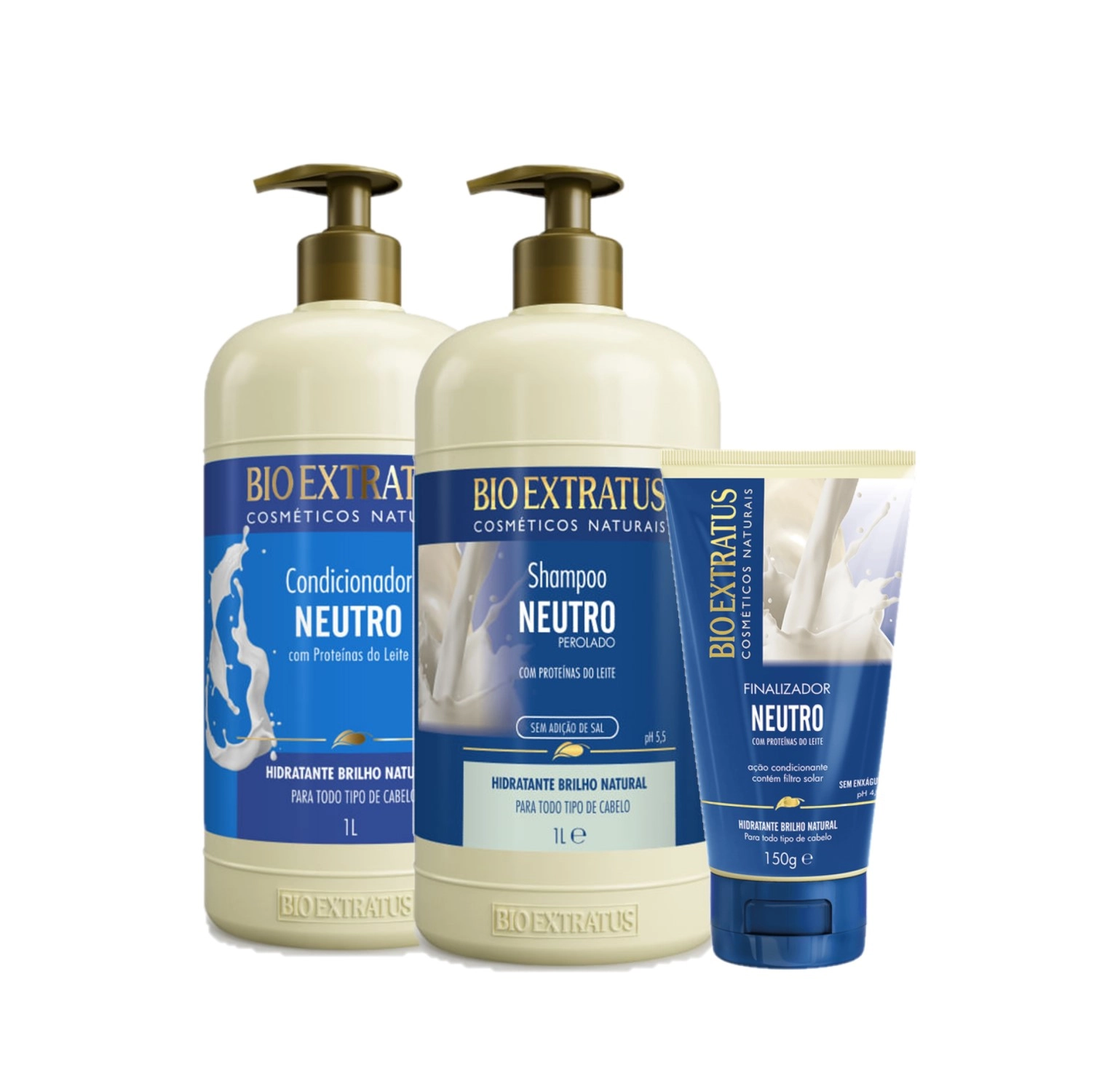 Bio Extratus Neutro, Proteínas do Leite limpa e hidrata profundamente o cabelo secos deixando macios e com brilho. Sua fórmula contém proteínas naturais para hidratar e realçar o brilho dos cabelos, sua formula é indicada para limpar delicadamente todos os tipos de cabelos, inclusive os cabelos tingidos. Bio Extratus Neutro - Condicionador 1L: para todos os tipos de cabelo. Bio Extratus Neutro promove ação hidratante que condiciona, desembaraça e realça o brilho. pH 4,0. Bio Extratus - Finalizador 150g: pode ser usado diariamente no cabelo. Conta com ação condicionante e contém filtro solar. Deixa os cabelos hidratados, saudáveis, macios e brilhantes, além de protegidos. Shampoo: distribua uniformemente sobre o cabelo, massageando sem esfregar os fios. Enxágue bem e, se necessário, repita a aplicação. Condicionador: para uso diário, deve ser usado após o shampoo. Na hidratação semanal, aplique após o banho de creme, massageando suavemente. Para maior absorção dos ativos, deixe agir por alguns minutos. Enxágue. Finalizador: Aplique nos cabelos úmidos e distribua ao longo dos fios, principalmente nas regiões mais danificadas. Não enxágue. É fundamental sempre aplicar um produto protetor térmico antes do secador ou da chapinha. Isso ajuda a proteger os fios. Kit Bio Extratus Neutro Brilho Protegido (3 produtos)