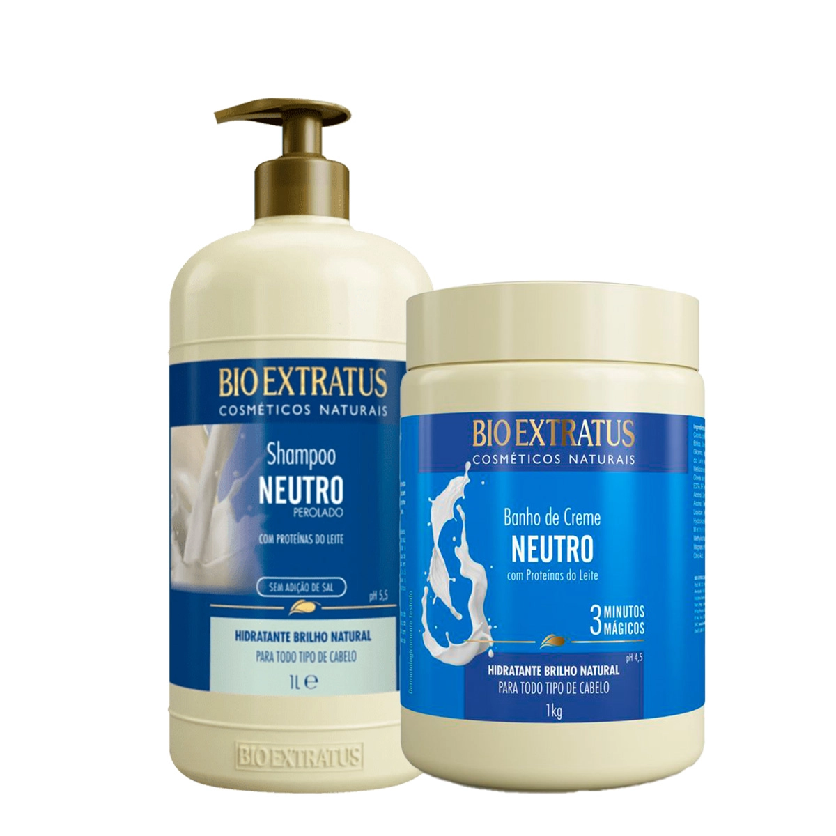 Bio Extratus Neutro Proteínas do Leite limpa e hidrata profundamente o cabelo secos deixando macios e com brilho. Sua fórmula contém proteínas naturais para hidratar e realçar o brilho dos cabelos, sua fórmula é indicada para limpar delicadamente todos os tipos de cabelos, inclusive os cabelos tingidos. Bio Extratus Neutro - Shampoo 1L: contém proteínas naturais para hidratar e realçar o brilho de todos os tipos de cabelo. Fórmula indicada para limpar delicadamente os fios. pH 5,5. Sem adição de sal. Bio Extratus Neutro - Máscara 1L: com base neutra e ingredientes suaves, enriquecidas com proteínas naturais do leite. Limpa delicadamente os fios e promove um tratamento hidratante que confere proteção, maciez e realça o brilho natural do cabelo. Conselho de aplicação Kit Bio Extratus Neutro Shampoo e Máscara (2 produtos)