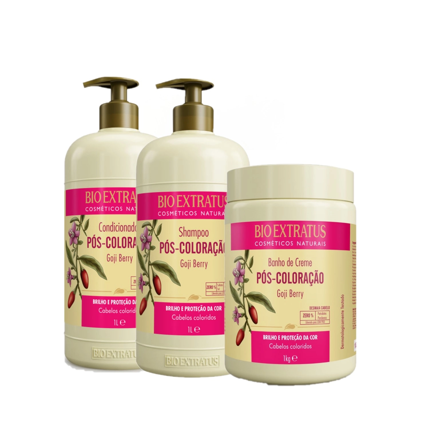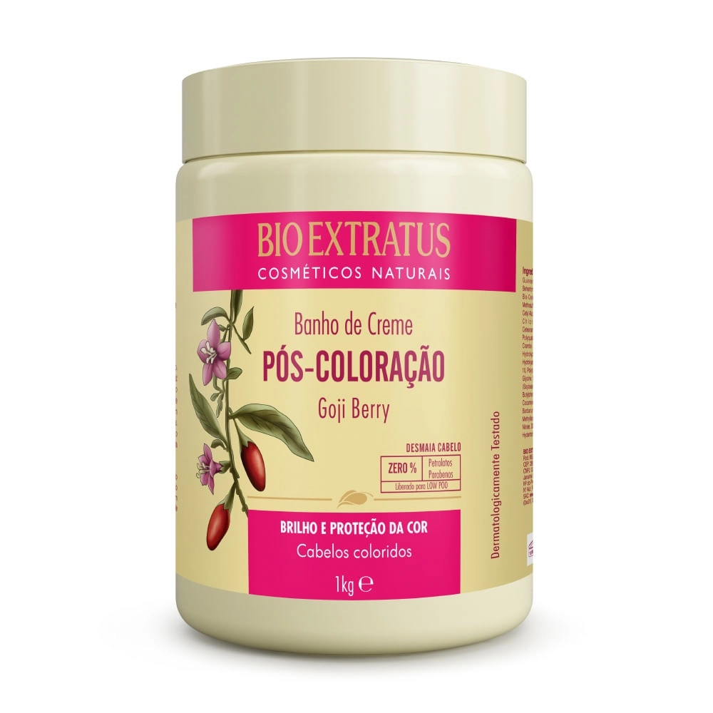 O Banho De Creme Bio Extratus Pós-Coloração foi desenvolvido especialmente para cabelos coloridos, proporciona hidratação profunda, restaura o brilho e a saúde dos fios, além de proteger das agressões químicas. Bio Extratus Pós-Coloração - Shampoo 1L: sem adição de sal, livre de sulfatos, ideal para promover uma limpeza suave e eficiente dos fios coloridos. Rico em antioxidantes, preserva o brilho e a cor. Liberado para a técnica Low Poo. Bio Extratus Pós-Coloração - Condicionador 1L: fórmula com ação antioxidante que preserva a cor e promove o tratamento diário dos fios coloridos. Condiciona, desembaraça, restaura a saúde e o brilho dos cabelos. Liberado para a técnica Low Poo. Bio Extratus Pós-Coloração - Banho de Creme 1L: hidratação e nutrição profundas, restaura o brilho e a saúde dos fios, protege das agressões químicas e tem ação antioxidante que preserva a cor. Liberado para a técnica Low Poo. Shampoo: aplique nos cabelos molhados, massageando suavemente. Enxágue. Se necessário, repita a aplicação. Condicionador: após lavar os cabelos, aplique o condicionador, massageando suavemente. Na hidratação semanal, aplique após o banho de creme. Para maior absorção dos ativos, deixe agir por alguns minutos. Enxágue. Máscara: Com os cabelos limpos e úmidos, aplique o creme massageando da raiz até as pontas. Deixe agir por 2 minutos. Enxágue.Kit Bio Extratus Pós-Coloração Nutrição da Cor (3 produtos)