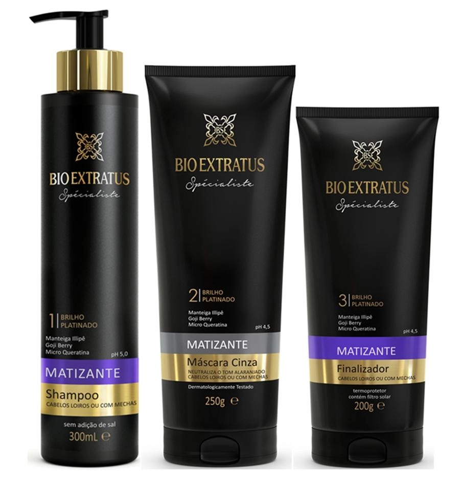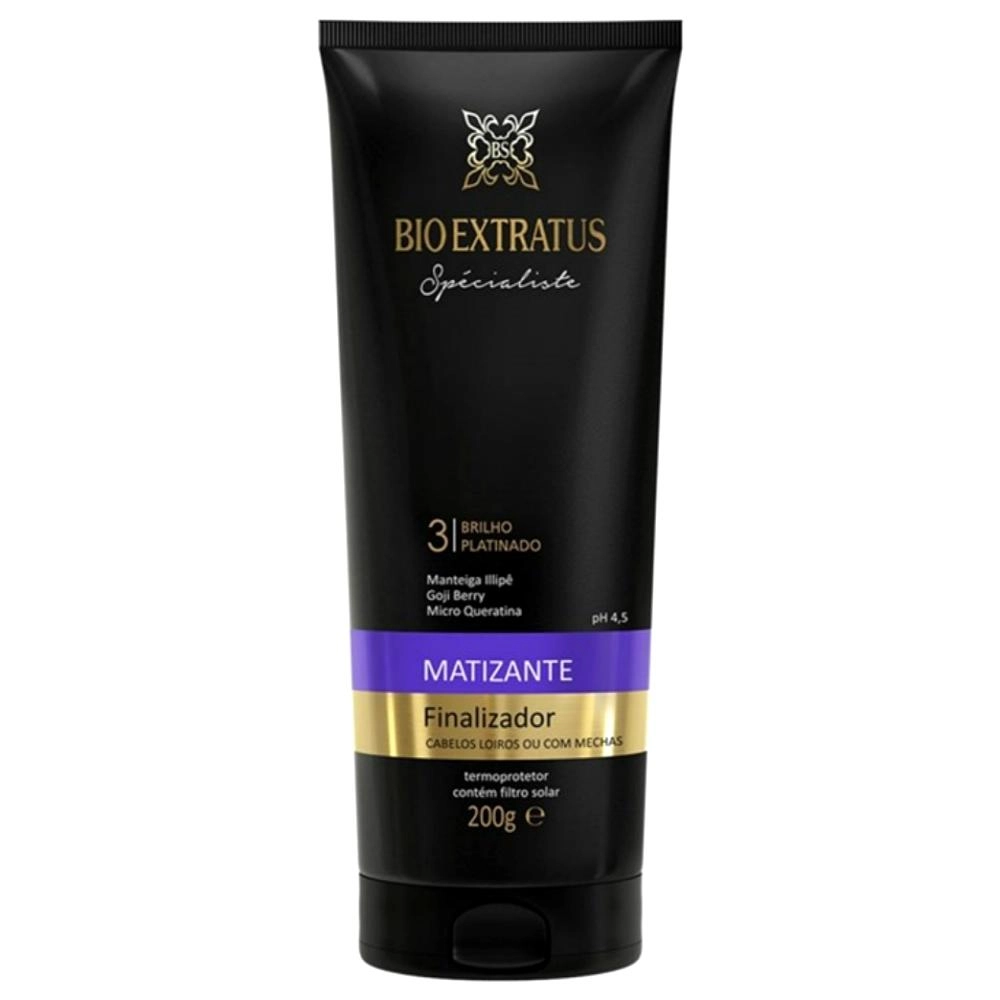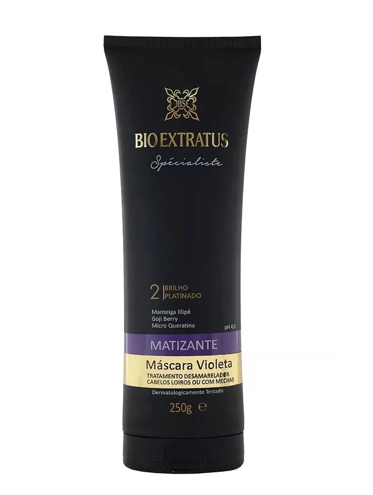 Fórmula com alto poder de tratamento que combina a ação antioxidante, reconstrutora e hidratante dos ativos naturais, promovendo um tratamento completo dos fios.Possui alta concentração de pigmento violeta que neutraliza os tons amarelados, desde a primeira aplicação. Tratamento Matizante com ação antioxidante, reconstrutor e hidratante que promove um tratamento completo dos fios. Neutraliza os tons amarelados e alaranjados e confere brilho platinado, desde a primeira aplicação. INDICAÇÃO: Cabelos loiros, com mechas e brancos. FUNÇÃO: Neutralizar os tons amarelados e alaranjados. Possui ação condicionante e termoprotetora que facilita a escovação. Contém filtro solar e protege os fios da oxidação. RESULTADOS E BENEFÍCIOS: Hidrata, repara os danos e confere brilho platinado. MODO DE USO: Aplique sobre o cabelo úmido e distribua ao longo dos fios, principalmente nas pontas e regiões mais danificadas. Não enxágue. Penteie normalmente. Pode ser usado antes de escovar, para proteger os fios. O Shampoo Matizante Limpeza Eficiente foi desenvolvido para cabelos loiros, com mechas e brancos. Proporcionar uma neutralização dos tons amarelos e alaranjados e deixando o cabelo com mais brilho e reparando a fibra capilar do fio, assim deixando o fio mais alinhado e macio.Máscara Spécialiste Matizante Violeta 250g Bio Extratus