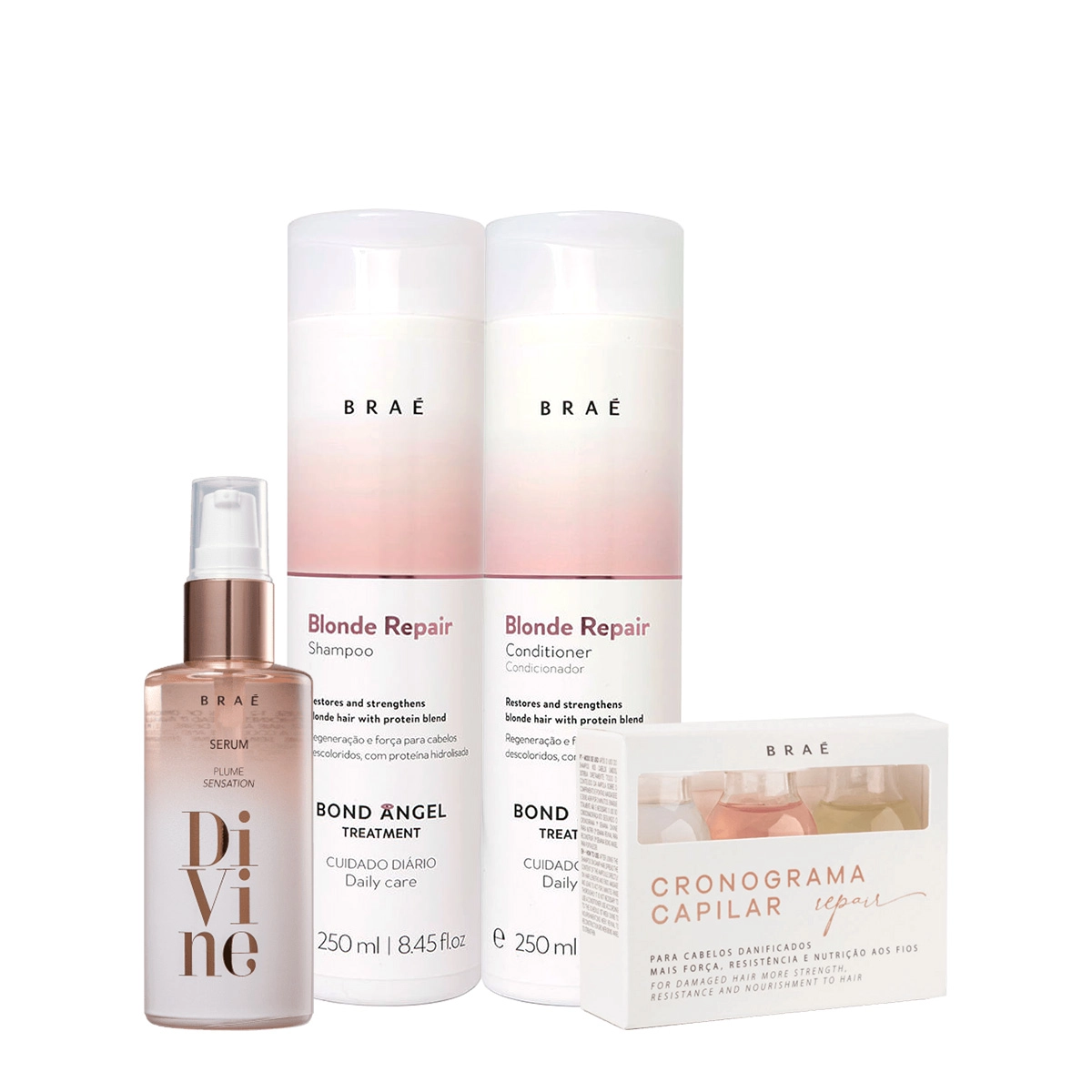 Kit Braé Blond Repair Shampoo Condicionador Divine Plume Sensation Sérum e Cronograma Repair (4 produtos)
