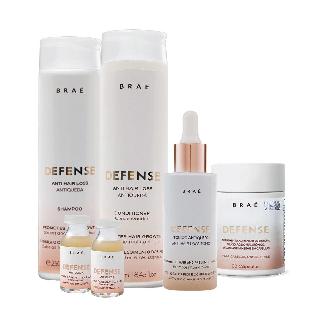 Kit Braé Defense Antiqueda Hair Loss Total (5 produtos) Esse kit contém Braé Defense Antiqueda Hair Loss - Shampoo 250ml: de ação fortalecedora e regeneradora, o Shampoo Defense nutre e tonifica o couro cabeludo, enquanto limpa e delicadamente, sem agredir a barreira cutânea ou ressecar os cabelos crescimento de fios fortes e resistentes e previne a queda de cabelo. Braé Defense Antiqueda Hair Loss - Condicionador 250ml: alto poder vitalizante, o Condicionador Defense enquanto sela as cutículas e desembaraça, promove resistência, força e flexibilidade ao fio. Contém ativos antifiamento e biotina, que estimulam e melhoram o crescimento do cabelo, diminui a queda e recupera a espessura do fio. Braé Defense Antiqueda Hair Loss - Suplemento Alimentar 30 Cápsulas: é um nutracêutico em capsulas que contém 18 vitaminas e minerais, além do ácido hialurônico e aminoácido, cisteína, presente na formulação, o mineral zinco contribui para a manutenção da pele, cabelos e unhas, enquanto as vitaminas A, C, e D auxiliam no funcionamento do sistema imune. Braé Defense Antiqueda Hair Loss - Tônico Capilar 60ml: condicionante que traz uma associação de ativos de alta performance, comprovadamente eficazes no tratamento antiqueda age diretamente no bulbo capilar, estimulando o crescimento dos fios, evitando a queda e regulando as diferentes fases de crescimento dos cabelos. Braé Defense Antiqueda Power Dose - Ampola Capilar 13ml (2 unidades): ampola de tratamento contra a queda capilar. Oferece ação rápida e direta no bulbo capilar, estimulando o crescimento dos fios. Traz fórmula ultra concentrada com ação intensa e instantânea, estimulando o crescimento dos fios, evitando a queda e regulando as diferentes fases do crescimento do cabelo. Conselho de Aplicação