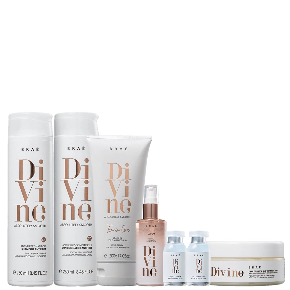 A linha Braé Divine oferece o cuidado necessário para controlar o frizz e o volume. Suas fórmulas limpam, desembaraçam, hidratam e nutrem os fios. É ótimo para tem cabelo natural ou alisado e deseja manter o efeito alinhado diariamente. Este Kit Contém BRAÉ Divine - Shampoo 250ml: Deixa os fios mais alinhados e disciplinados durante a limpeza. BRAÉ Divine - Condicionador 250ml: Traz um cuidado hidratante que desembaraça e disciplina os fios rebeldes. BRAÉ Divine - Máscara Home Care 200g: Fortalece, proporciona maciez, recupera o brilho e a maleabilidade. Ideal para prolongar o efeito liso, tratar as camadas mais externas do fio e hidratar completamente. BRAÉ Divine - Leave-in Ten in One 200g: Proporciona hidratação, ação antifrizz, força, proteção térmica, maciez, brilho, proteção UV, ação antiquebra e maleabilidade. Além disso, garante uma modelagem leve nos fios. Com ele, seu cabelo fica revitalizado e nutrido. BRAÉ Divine - Sérum Plume Sensation 60ml: Promove alinhamento das cutículas, impede aspecto pesado nos fios, confere elasticidade e garante toque sedoso. Seu cabelo fica leve e com balanço natural. BRAÉ Divine - Ampola Power Dose 13ml: promove reparação, hidratação e brilho intenso de maneira rápida e com ação imediata. Como Usar Conselho de Aplicação Aplique o shampoo nos cabelos molhados e massageie o couro cabeludo até formar espuma. Enxágue e repita o procedimento se sentir necessidade. Lave o cabelo com shampoo e agite a ampola antes de usar. Aplique sobre os fios limpos e úmidos, enluvando mecha a mecha. Deixe Agir por 3 minutos e enxágue. Espalhe o condicionador sobre os fios úmidos depois de usar o shampoo. Comece pelas pontas, massageie suavemente e deslize os fios entre os dedos até que estejam desembaraçados. Deixe agir por alguns minutos e enxágue. Aplique a máscara capilar, mecha a mecha, e massageie suavemente. Deixe agir durante 20 minutos. Em seguida, enxágue bem. Aplique o leave-in diretamente no comprimento e pontas do cabelo seco ou úmido. Não necessita de enxágue. Finalize como desejar. Aplique algumas gotas do sérum na palma das mãos e espalhe no comprimento dos cabelos até completa absorção. Finalize como desejar. Kit Brae Divine Anti Frizz (7 produtos)