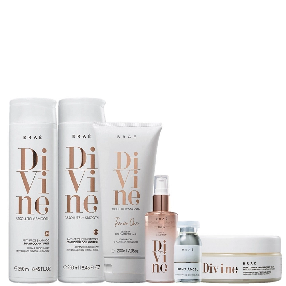 A linha Braé Divine oferece o cuidado necessário para controlar o frizz e o volume. Suas fórmulas limpam, desembaraçam, hidratam e nutrem os fios. É ótimo para tem cabelo natural ou alisado e deseja manter o efeito alinhado diariamente. Este Kit Contém BRAÉ Divine - Shampoo 250ml: Deixa os fios mais alinhados e disciplinados durante a limpeza. BRAÉ Divine - Condicionador 250ml: Traz um cuidado hidratante que desembaraça e disciplina os fios rebeldes. BRAÉ Divine - Máscara Home Care 200g: Fortalece, proporciona maciez, recupera o brilho e a maleabilidade. Ideal para prolongar o efeito liso, tratar as camadas mais externas do fio e hidratar completamente. BRAÉ Divine - Leave-in Ten in One 200g: Proporciona hidratação, ação antifrizz, força, proteção térmica, maciez, brilho, proteção UV, ação antiquebra e maleabilidade. Além disso, garante uma modelagem leve nos fios. Com ele, seu cabelo fica revitalizado e nutrido. BRAÉ Divine - Sérum Plume Sensation 60ml: Promove alinhamento das cutículas, impede aspecto pesado nos fios, confere elasticidade e garante toque sedoso. Seu cabelo fica leve e com balanço natural. BRAÉ Bond Angel - Blond Power 13ml: é ideal para o seu cuidado pós-química, já que fortalece o fio e ajuda a reconstruir a fibra capilar. Como Usar Conselho de Aplicação Aplique o shampoo nos cabelos molhados e massageie o couro cabeludo até formar espuma. Enxágue e repita o procedimento se sentir necessidade. Lave o cabelo com shampoo e agite a ampola antes de usar. Aplique sobre os fios limpos e úmidos, enluvando mecha a mecha. Deixe Agir por 3 minutos e enxágue. Espalhe o condicionador sobre os fios úmidos depois de usar o shampoo. Comece pelas pontas, massageie suavemente e deslize os fios entre os dedos até que estejam desembaraçados. Deixe agir por alguns minutos e enxágue. Aplique a máscara capilar, mecha a mecha, e massageie suavemente. Deixe agir durante 20 minutos. Em seguida, enxágue bem. Aplique o leave-in diretamente no comprimento e pontas do cabelo seco ou úmido. Não necessita de enxágue. Finalize como desejar. Aplique algumas gotas do sérum na palma das mãos e espalhe no comprimento dos cabelos até completa absorção. Finalize como desejar. Kit Brae Divine Anti Frizz Cabelos Loiros (6 produtos)