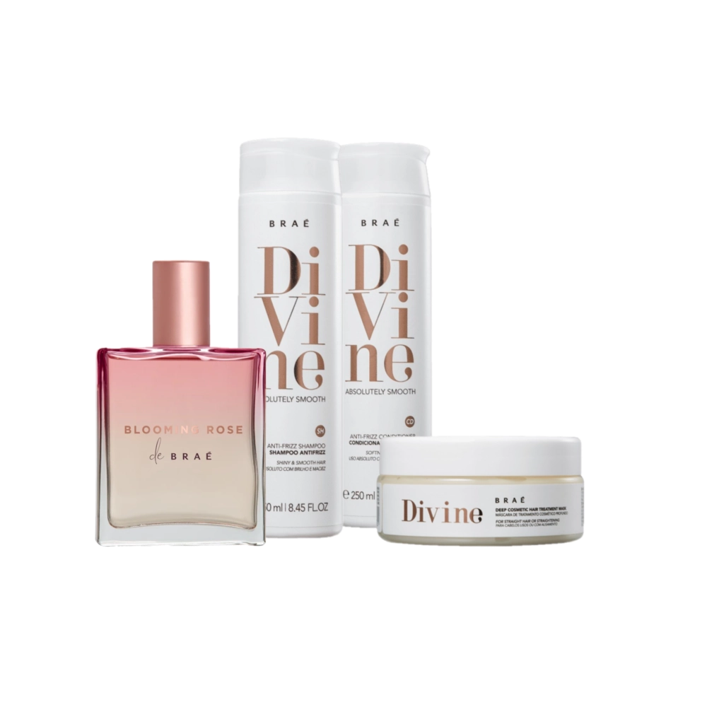 Este Kit Contém Braé Divine - Shampoo 250ml: para cabelos com frizz, deixa os fios mais alinhados e disciplinados durante a limpeza. Combina ativos com tecnologias para eliminar o volume e proporcionar um cabelo mais controlado. É perfeito para quem já tem química e deseja manter o efeito liso duradouro. Braé Divine - Condicionador 250ml: para cabelos com frizz, condiciona trazendo um cuidado hidratante que desembaraça e disciplina os fios rebeldes. Braé Divine - Máscara Capilar 200g: nutre intensamente, restaura e alinha os fios. Também fortalece, proporciona maciez, recupera o brilho e a maleabilidade. Ideal para prolongar o efeito liso, tratar as camadas mais externas do fio e hidratar completamente. Braé Blooming Rose - Perfume para Cabelo 50ml: especialmente desenvolvido para deixar uma aura perfumada e brilhante sobre os fios. Fórmula leve, não contém silicone e deixa o cabelo com aspecto natural e saudável. É absorvido rapidamente pelos fios deixando um aroma perfumado aonde quer que você vá. Conselho de Aplicação Shampoo: aplique no cabelo molhado, massageando suavemente sem esfregar os fios. Enxague. Condicionador: deve ser usado após o shampoo, aplique massageando suavemente do comprimento às pontas. Deixe agir de 1 a 2 minutos. Enxague. Máscara: com os cabelos limpos e úmidos, aplique a máscara capilar, mecha a mecha, e massageie suavemente. Deixe agir durante 20 minutos. Em seguida, enxague bem. Perfume: pode ser usado no corpo e sobre os cabelos secos ou úmidos. Pulverize sobre os fios, penteando em seguida, para distribuir de maneira uniforme. Dica: Perfume Blooming Rose deve ser o último produto a ser usado em sua rotina, depois do shampoo, do condicionador e do finalizador. Kit Braé Divine Blooming Rose Quarteto (4 produtos)