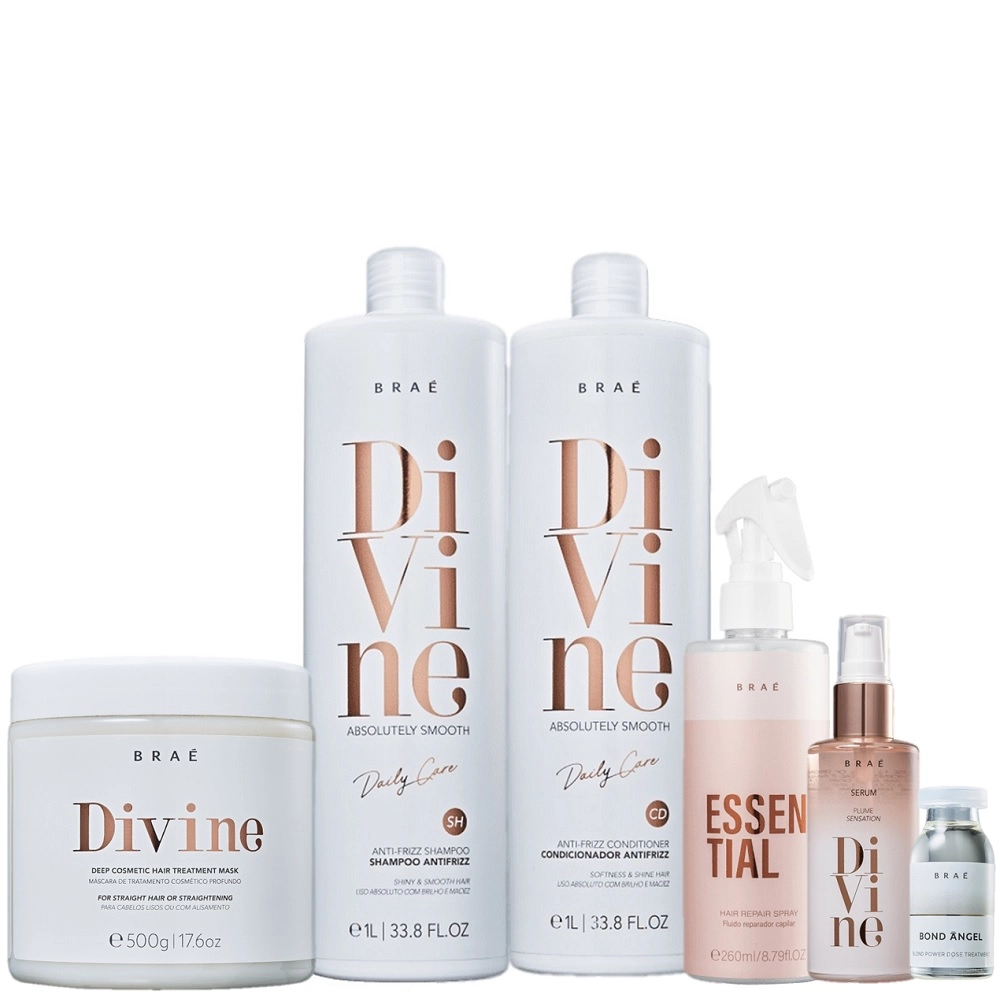 A linha Braé Divine oferece o cuidado necessário para controlar o frizz e o volume. Suas fórmulas limpam, desembaraçam, hidratam e nutrem os fios. É ótimo para tem cabelo natural ou alisado e deseja manter o efeito alinhado diariamente. Este Kit Contém BRAÉ Divine - Shampoo 1000ml: limpa e deixa os fios mais alinhados e disciplinados. Possui em sua fórmula ativos com tecnologias que eliminam o volume e proporcionam um cabelo mais controlado. É ideal para quem já tem química e deseja manter o efeito liso duradouro. BRAÉ Divine - Condicionador 1000ml: proporciona um cuidado hidratante que desembaraça e disciplina os fios rebeldes. Sua fórmula combina ativos com tecnologias para eliminar o volume e proporcionar um cabelo mais controlado. É indicado para cabelos com química e que precisam manter o efeito liso duradouro. BRAÉ Divine - Máscara Capilar 500g: nutre intensamente, restaura e alinha. Também fortalece, proporciona maciez e um tratamento profundo enquanto restaura o brilho e a maleabilidade. Ideal para prolongar o efeito liso, tratar as camadas mais externas do fio e hidratar por completo BRAÉ Essential - Fluido Reparador 260ml oferece hidratação progressiva e repara os danos acumulados, além de ajudar a reestruturar a fibra capilar. BRAÉ Divine - Sérum Plume Sensation 60ml: Promove alinhamento das cutículas, impede aspecto pesado nos fios, confere elasticidade e garante toque sedoso. Seu cabelo fica leve e com balanço natural. BRAÉ Bond Angel - Blond Power 13ml: é ideal para o seu cuidado pós-química, já que fortalece o fio e ajuda a reconstruir a fibra capilar. Como Usar Conselho de Aplicação Shampoo: aplique o shampoo nos cabelos molhados e massageie o couro cabeludo até formar espuma. Enxágue. Repita o procedimento se sentir necessidade. Condicionador: Espalhe o condicionador sobre os fios úmidos depois de usar o shampoo. Comece pelas pontas, massageie suavemente e deslize os fios entre os dedos até que estejam desembaraçados. Deixe agir por alguns minutos e enxágue. Máscara Capilar: com os cabelos limpos e úmidos, aplique a máscara capilar, mecha a mecha, e massageie suavemente. Deixe agir durante 20 minutos e depois enxágue bem. Ampola: lave o cabelo com shampoo e agite a ampola antes de usar. Aplique sobre os fios limpos e úmidos, enluvando mecha a mecha. Deixe agir por 3 minutos e enxágue. Sérum: aplique algumas gotas do sérum na palma das mãos e espalhe no comprimento dos cabelos até completa absorção. Finalize como desejar. Essential 260ml: Agite antes de usar. Com os cabelos úmidos ou secos, aplique uma pequena quantidade de produto diretamente sobre o comprimento e pontas dos fios. Espalhe bem e finalize com como preferir. Kit Brae Divine Bond Power (6 Produtos)