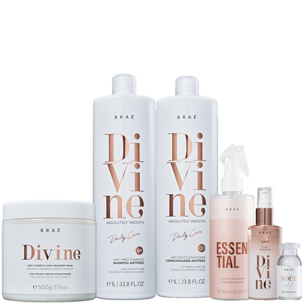 A linha Braé Divine oferece o cuidado necessário para controlar o frizz e o volume. Suas fórmulas limpam, desembaraçam, hidratam e nutrem os fios. É ótimo para tem cabelo natural ou alisado e deseja manter o efeito alinhado diariamente. Este Kit Contém BRAÉ Divine - Shampoo 1000ml: limpa e deixa os fios mais alinhados e disciplinados. Possui em sua fórmula ativos com tecnologias que eliminam o volume e proporcionam um cabelo mais controlado. É ideal para quem já tem química e deseja manter o efeito liso duradouro. BRAÉ Divine - Condicionador 1000ml: proporciona um cuidado hidratante que desembaraça e disciplina os fios rebeldes. Sua fórmula combina ativos com tecnologias para eliminar o volume e proporcionar um cabelo mais controlado. É indicado para cabelos com química e que precisam manter o efeito liso duradouro. BRAÉ Divine - Máscara Capilar 500g: nutre intensamente, restaura e alinha. Também fortalece, proporciona maciez e um tratamento profundo enquanto restaura o brilho e a maleabilidade. Ideal para prolongar o efeito liso, tratar as camadas mais externas do fio e hidratar por completo BRAÉ Essential - Fluido Reparador 260ml oferece hidratação progressiva e repara os danos acumulados, além de ajudar a reestruturar a fibra capilar. BRAÉ Divine - Sérum Plume Sensation 60ml: Promove alinhamento das cutículas, impede aspecto pesado nos fios, confere elasticidade e garante toque sedoso. Seu cabelo fica leve e com balanço natural. BRAÉ Soul Color - Booster Ampoule 13ml: hidrata, resgata a maciez e evita a oxidação da cor, além de fortalecer e proteger a fibra capilar. Como Usar Conselho de Aplicação Shampoo: aplique o shampoo nos cabelos molhados e massageie o couro cabeludo até formar espuma. Enxágue. Repita o procedimento se sentir necessidade. Condicionador: Espalhe o condicionador sobre os fios úmidos depois de usar o shampoo. Comece pelas pontas, massageie suavemente e deslize os fios entre os dedos até que estejam desembaraçados. Deixe agir por alguns minutos e enxágue. Máscara Capilar: com os cabelos limpos e úmidos, aplique a máscara capilar, mecha a mecha, e massageie suavemente. Deixe agir durante 20 minutos e depois enxágue bem. Ampola: lave o cabelo com shampoo e agite a ampola antes de usar. Aplique sobre os fios limpos e úmidos, enluvando mecha a mecha. Deixe agir por 3 minutos e enxágue. Sérum: aplique algumas gotas do sérum na palma das mãos e espalhe no comprimento dos cabelos até completa absorção. Finalize como desejar. Essential 260ml: Agite antes de usar. Com os cabelos úmidos ou secos, aplique uma pequena quantidade de produto diretamente sobre o comprimento e pontas dos fios. Espalhe bem e finalize com como preferir. Kit Brae Divine Color Booster (6 Produtos)