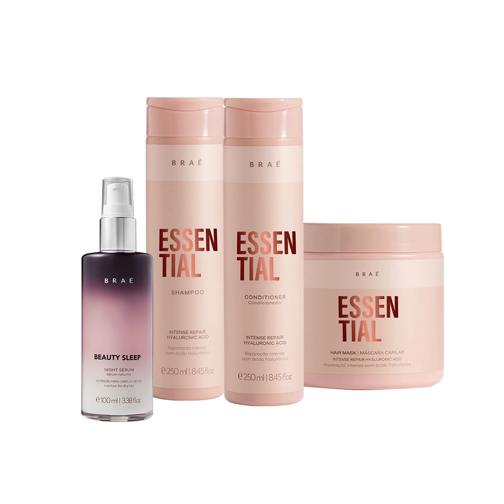 Este Kit Contém Braé Essential - Shampoo 250ml: para cabelos danificados e fragilizados, limpa e ajuda na recuperação dos fios desestruturados. Braé Essential - Condicionador 250ml: possui ação de nutrição e reparação, promove hidratação progressiva e protege o cabelo contra agressões diárias e térmicas. Com ácido hialurônico, aminoácidos e complexo de óleos, os cabelos ficam macios e com brilho. Possui proteção térmica. Braé Essential - Máscara 500g: recupera e protege a fibra capilar para que ela fique forte, brilhante e hidratada. Age internamente nos poros do cabelo para dar estrutura às áreas danificadas. Forma uma camada protetora em torno do fio para deixar o cabelo mais brilhante e resistente, com uma vida nova. Braé Beauty Sleep - Sérum Noturno 100ml: sua formulação é composta por quatro ativos principais: Niacinamida, Curveline, Fiber Plug in e Vitamina E. A união dos quatro previne a perda da cor dos cabelos coloridos e potencializa a nutrição dos fios, além de promover um equilíbrio da oleosidade do couro cabeludo e uma poderosa ação antifrizz. Conselho de Aplicação Shampoo: aplique no cabelo molhado, massageando suavemente sem esfregar os fios. Enxague. Condicionador: deve ser usado após o shampoo, aplique massageando suavemente do comprimento às pontas. Deixe agir de 1 a 2 minutos. Enxague. Máscara: após lavar o cabelo com shampoo, aplique massageando vigorosamente da raiz até as pontas. Deixe agir de 10 a 15 minutos. Enxague. Sérum: antes de dormir, aplique sobre os cabelos secos ou úmidos, mecha a mecha do comprimento às pontas e massageie bem. Caso decida aplicar nos fios molhados, seque com a toalha antes de começar. Deixe agir durante a noite. Se quiser, reaplique conforme necessário nos cabelos secos para uma nutrição adicional no day after. Não precisa enxaguar na manhã seguinte.Kit Braé Essential Beauty Sleep - Máscara G (4 produtos)