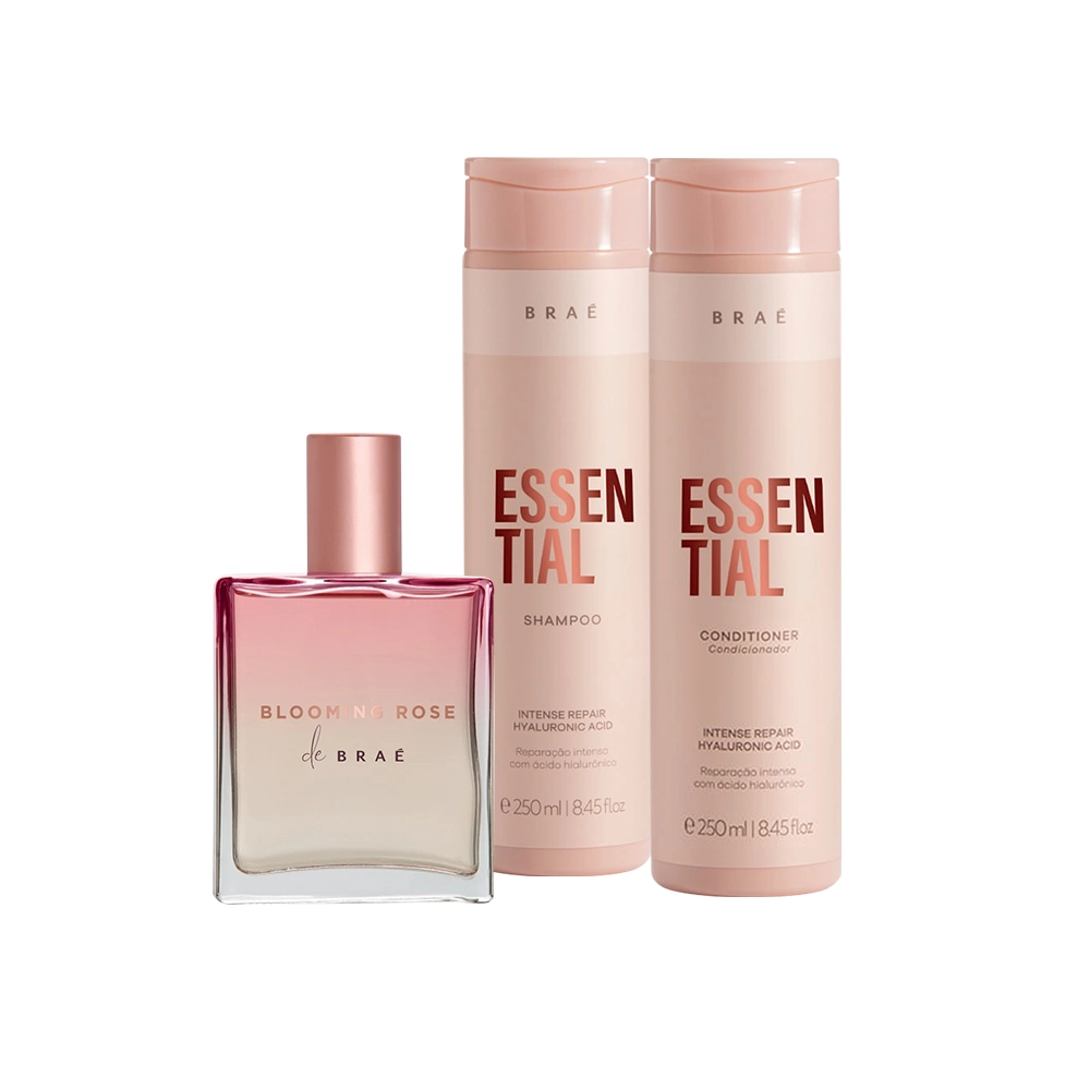Este Kit Contém Braé Essential - Shampoo 250ml: limpa reparando os fios danificados, promove hidratação progressiva e protege o cabelo contra agressões diárias e térmicas. Com ácido hialurônico, aminoácidos e complexo de óleos, os cabelos ficam mais fortalecidos. Braé Essential - Condicionador 250ml: possui ação de nutrição e reparação, que condiciona os fios, promovendo hidratação progressiva e protege o cabelo contra agressões diárias e térmicas. Com ácido hialurônico, aminoácidos e complexo de óleos, os cabelos ficam macios e com brilho. Possui proteção térmica. Braé Blooming Rose - Perfume para Cabelo 50ml: especialmente desenvolvido para deixar uma aura perfumada e brilhante sobre os fios. Fórmula leve, não contém silicone e deixa o cabelo com aspecto natural e saudável. É absorvido rapidamente pelos fios deixando um aroma perfumado aonde quer que você vá. Indicado para todos os tipos de cabelos. Conselho de Aplicação Shampoo: aplique no cabelo molhado, massageando suavemente sem esfregar os fios. Enxague. Condicionador: deve ser usado após o shampoo, aplique massageando suavemente do comprimento às pontas. Deixe agir de 1 a 2 minutos. Enxague. Perfume: pode ser usado no corpo e sobre os cabelos secos ou úmidos. Pulverize sobre os fios, penteando em seguida, para distribuir de maneira uniforme. Dica: Perfume Blooming Rose deve ser o último produto a ser usado em sua rotina, depois do shampoo, do condicionador e do finalizador. Kit Braé Essential Blooming Rose Trio (3 produtos)
